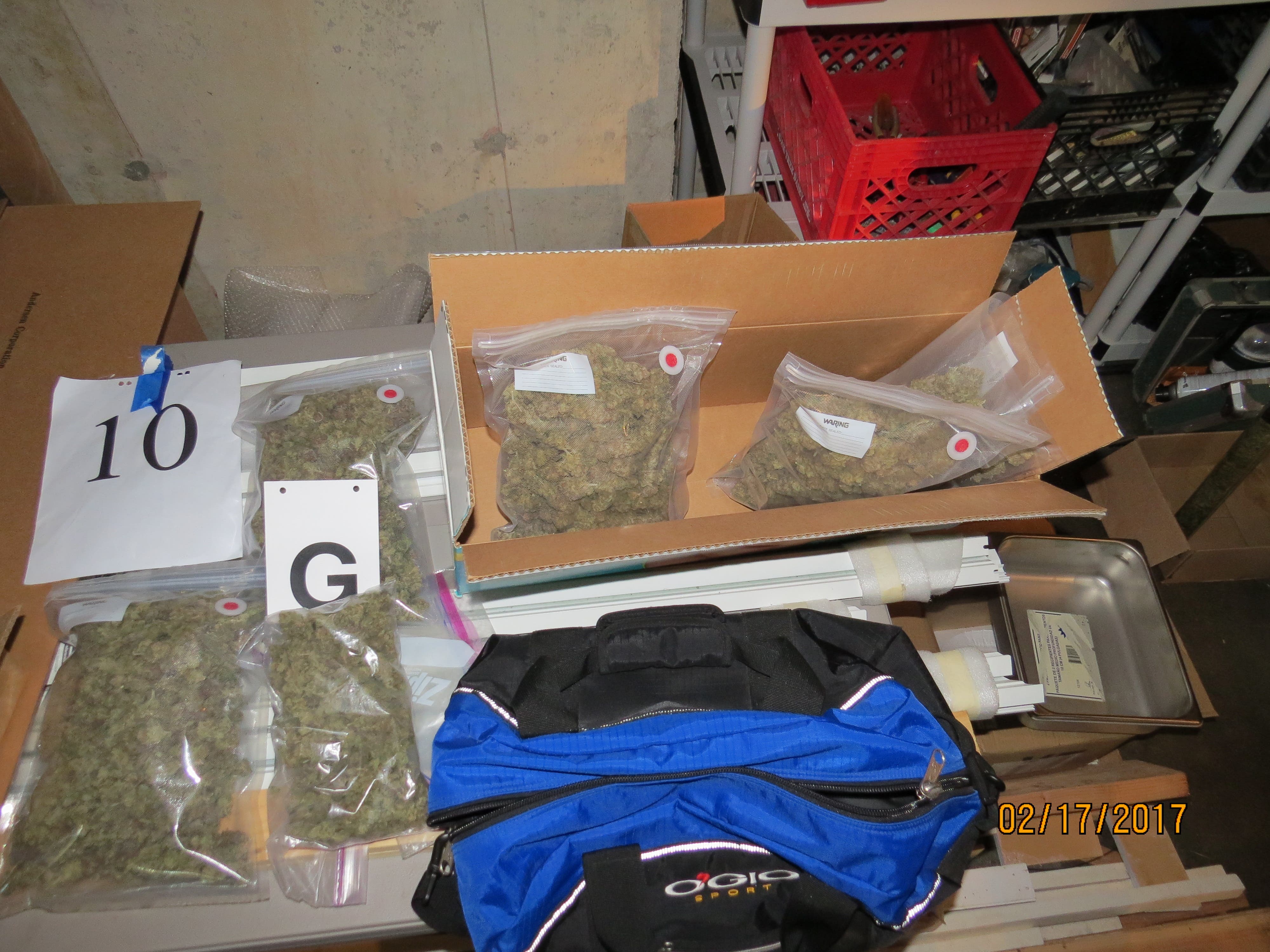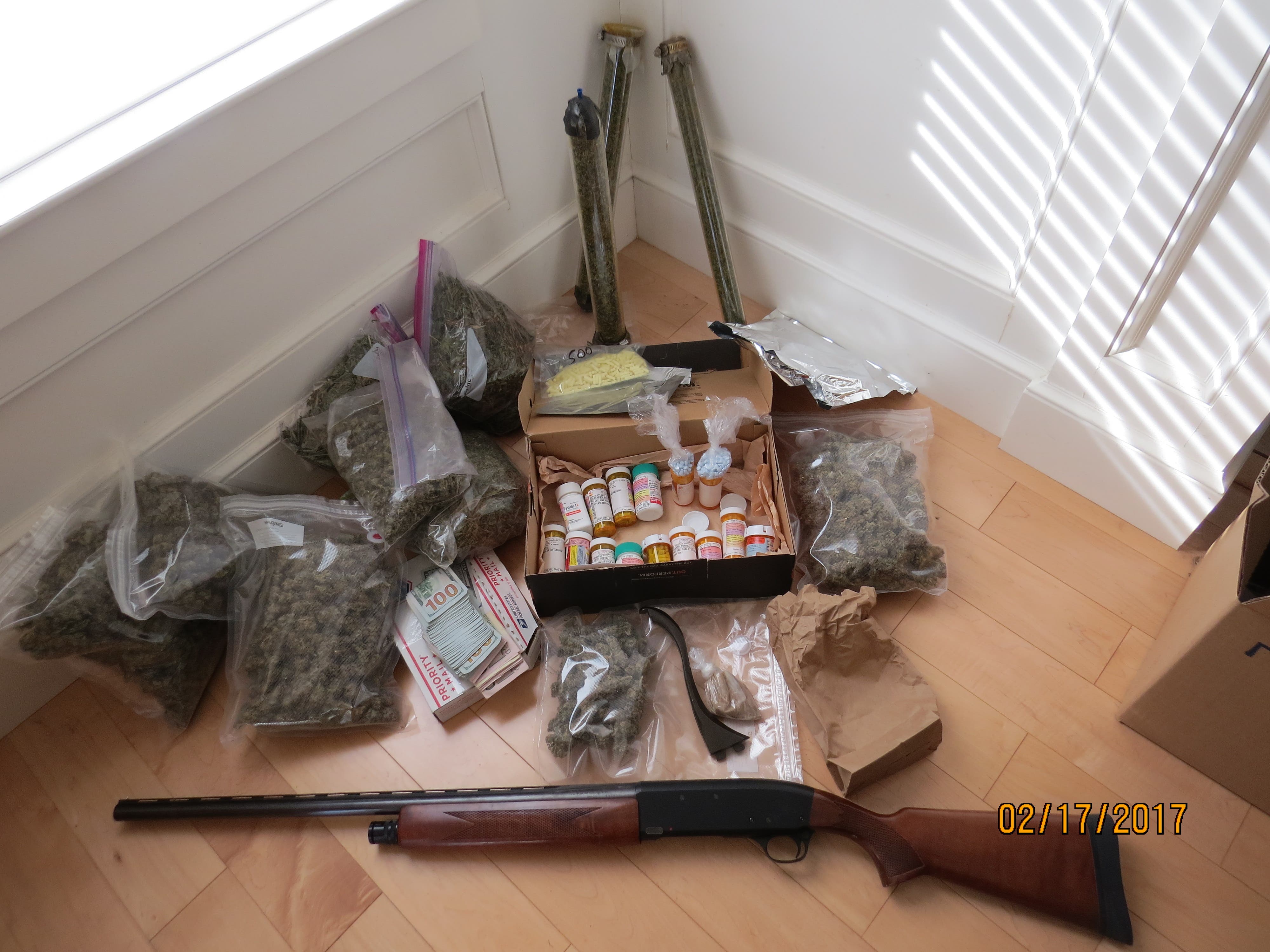 Investigators seized approximately four pounds of dried marijuana, more than 80 marijuana plants, 20 grams of heroin, more than 500 oxycodone pills, more than 1,000 Xanax, a loaded shotgun, a 2011 BMW, scales and $8,000, police said.