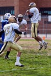 Try 306 total yards on the afternoon; 254 in the air on 19 for 30 passing, including a TD reception; and 143 yards on the ground, split between Justin Lee (60), Nick Pititto (40), and quarterback Matt Brennan (42), for three more touchdowns.