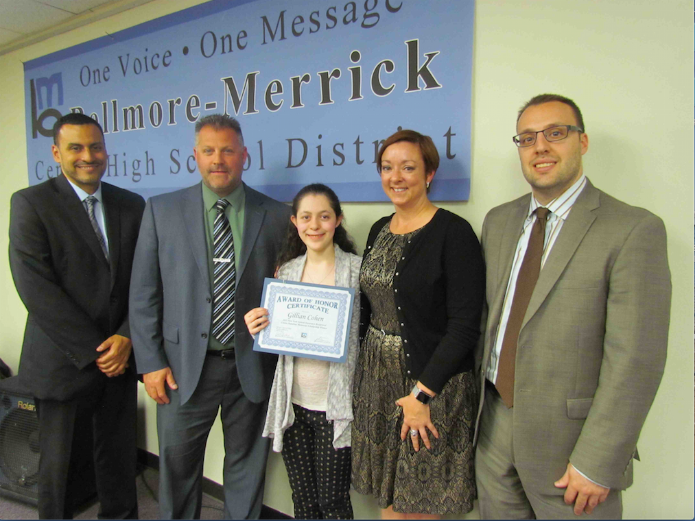 Caption: Calhoun High School senior Gillian Cohen, center, was congratulated at the Board of Education meeting by (from l. to r.), Calhoun’s assistant principals Eric Gomez and Ken Zisel, Principal Nicole Hollings and Assistant Principal Neil Testa. Photo courtesy of the Bellmore-Merrick Central High School District.