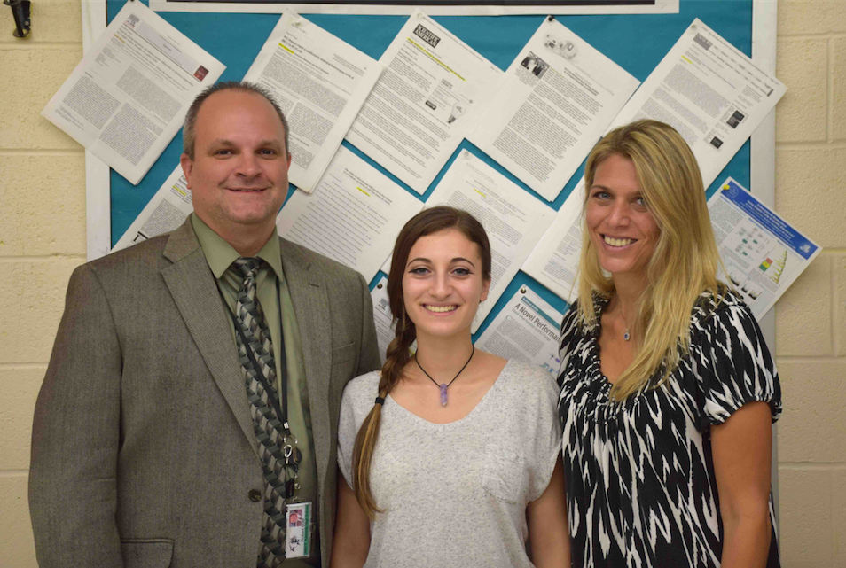 Photos courtesy of the Bellmore-Merrick School District: Kennedy High School senior Rachel Mashal (center) with Science Chair Robert Soel and Research Teacher Barbi Frank.