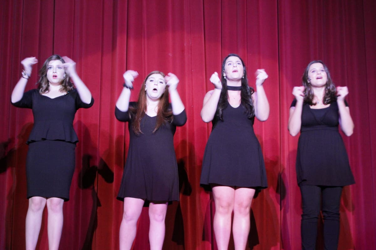 Photos courtesy of the Bellmore-Merrick Central High School District (Members of Mepham’s Skull and Bones Drama Club performed “A Night on Broadway.”)
