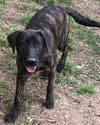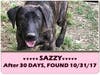 WITH THE HELP OF A NEIGHBOR, SAZZY WAS FOUND HALLOWEEN NIGHT!! This was her story...Sazzy, a rescued dog, has been lost and on the run since October 1st. We need your help!! Sazzy was an abused and discarded dog from Louisiana who was found living on cat food and roadkill. She's a Brindle mix meaning she has markings similar to a zebra though brown on black; and a tan mark across the bridge of her nose. She was brought to her adoptive family in Merrick on Sept 27th. While on the way to the vet to get microchipped, Sazzy jumped out of the car and fled. This was on Oct. 1st. She was first seen in the vicinity of the Merrick Jewish Center; and later moved north toward Merrick Avenue & Larkspur.