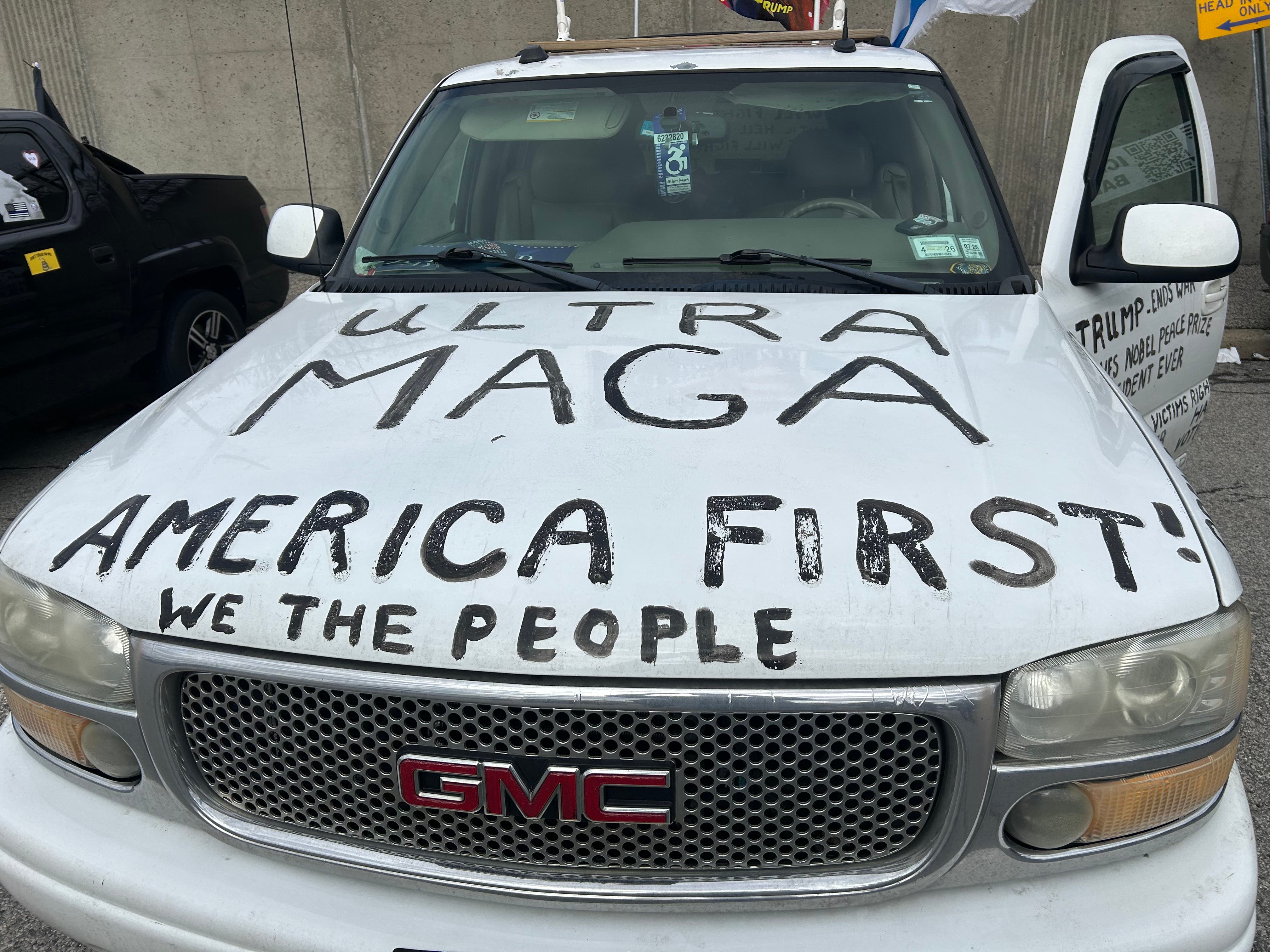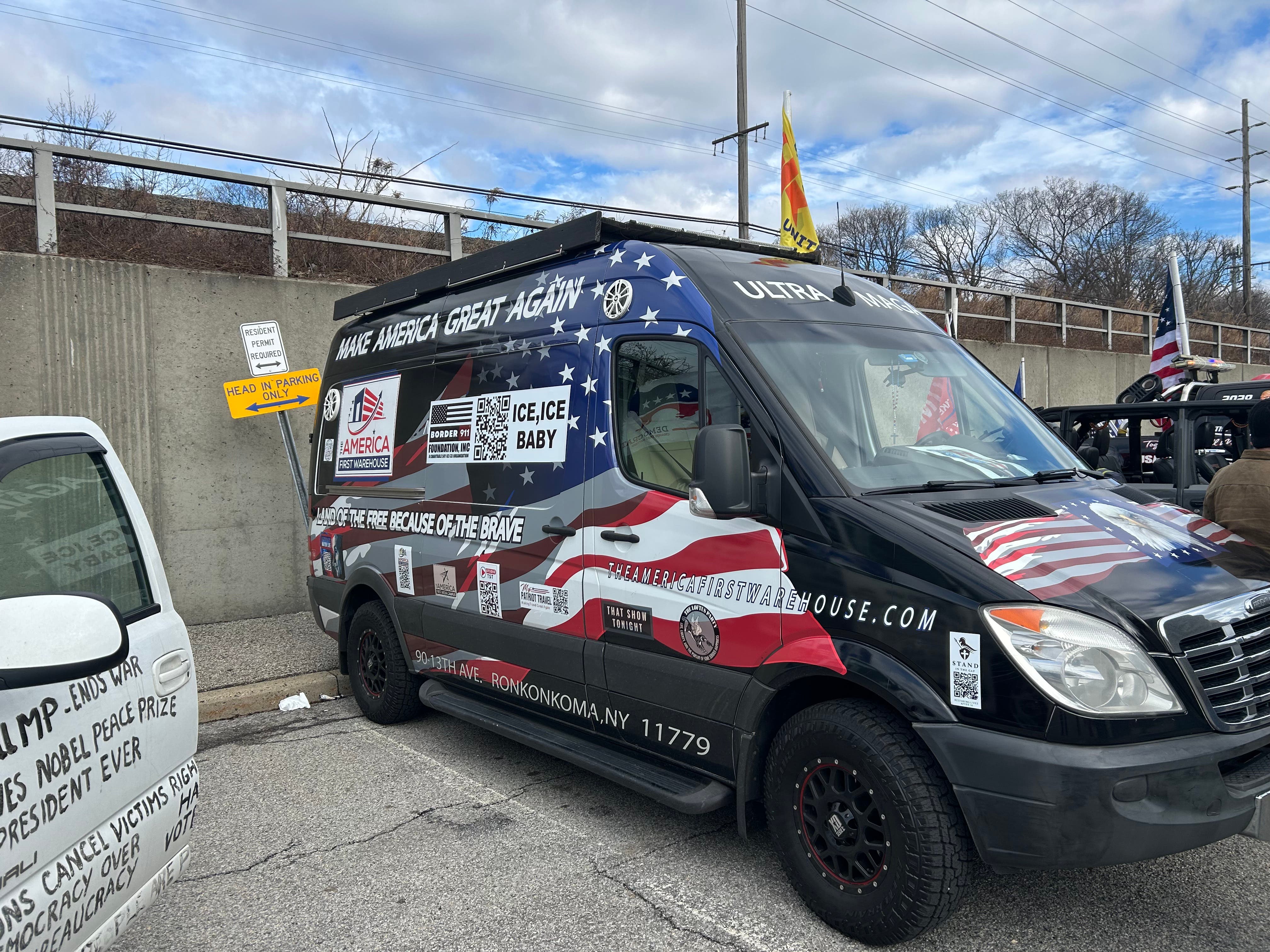 In the half hour before Saturday’s anti-ICE protests kicked off, there was also a group of counter protestors who gathered in the Bellmore LIRR station parking lot, parking trucks emblazoned with messages in support of ICE, President Donald Trump, and Turning Point USA founder Charlie Kirk. At this parking lot gathering, the music was a little bit different: Vanilla Ice’s, “Ice Ice Baby” and the Village People’s “YMCA,” which became a fixture at Trump’s campaign rallies in 2024, played from car speakers.