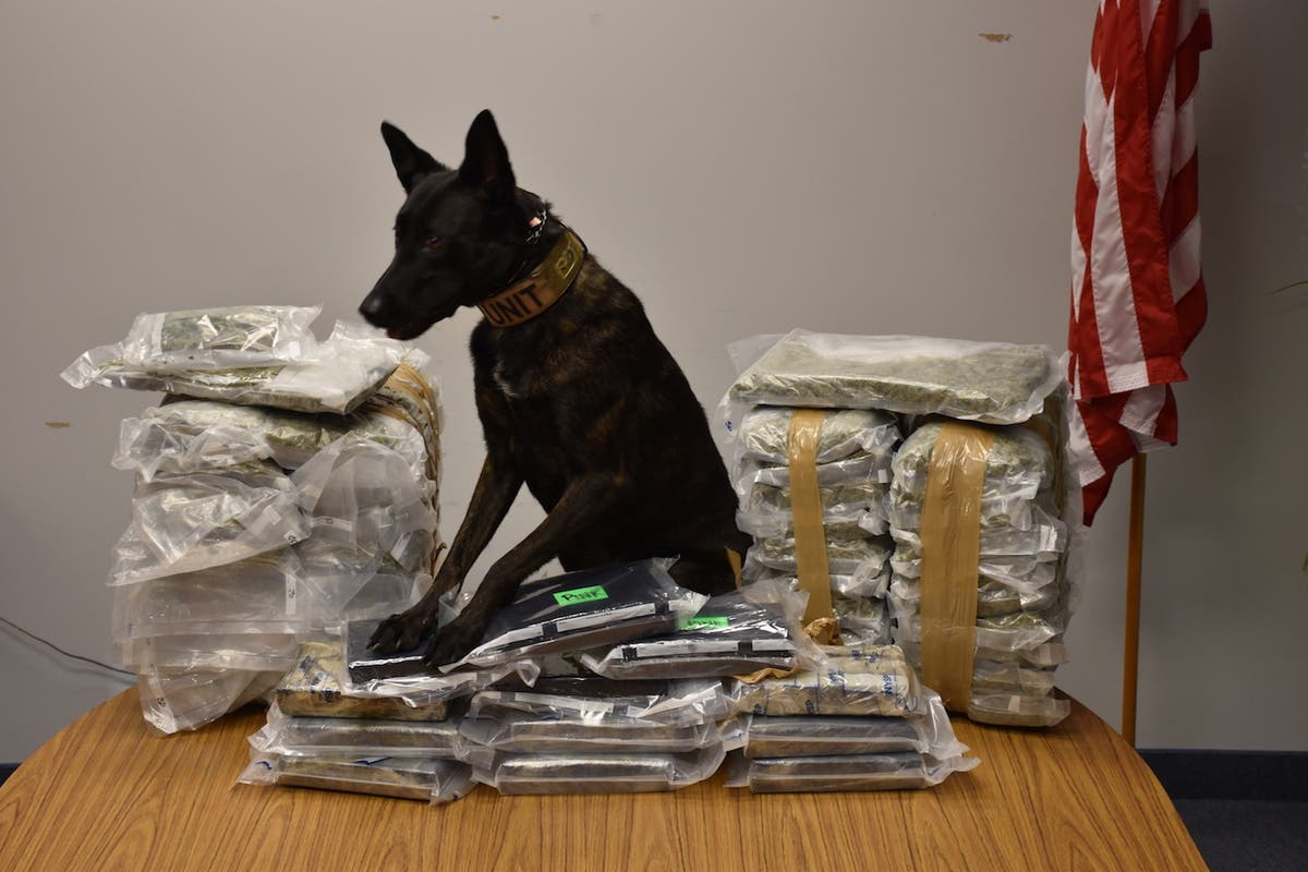 Photo caption: K-9 Rickle with the seized drugs. Photo credit: NYSP.