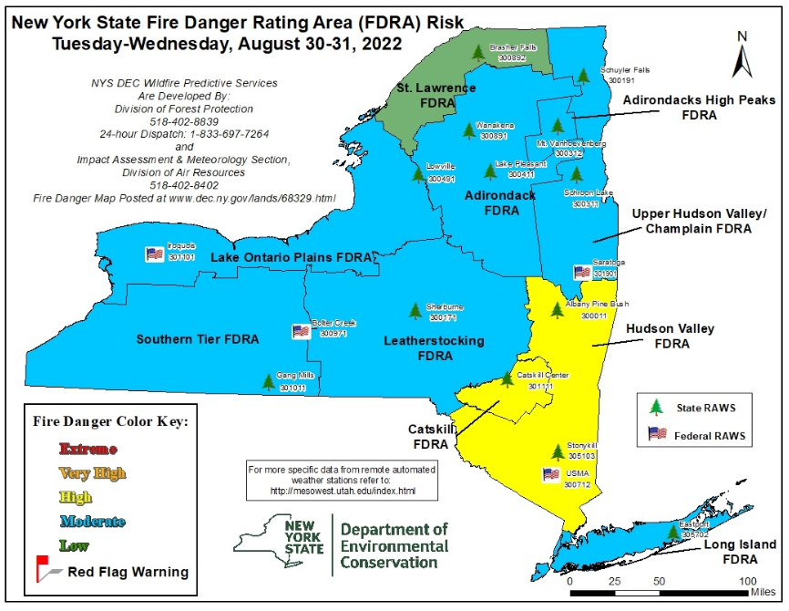 New York's Hudson Valley and Catskill regions remain at high fire danger risk, meaning outdoor fires have the potential to spread quickly, especially if the wind picks up. Fires may become serious and difficult to control unless successfully contained while small.