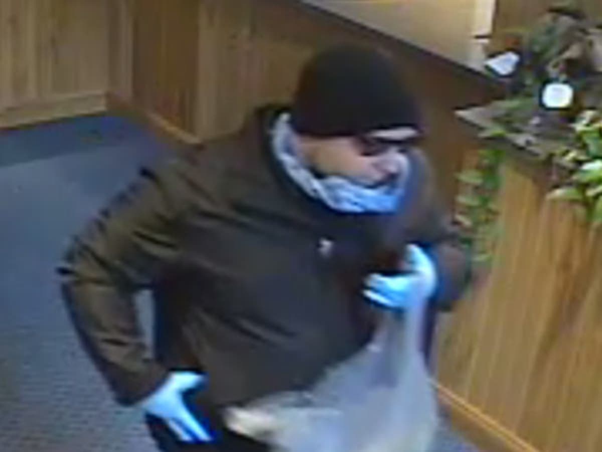 He was wearing a dark-colored winter cap, winter coat, dark-colored pants, blue latex-type gloves, a surgical mask and sun glasses.