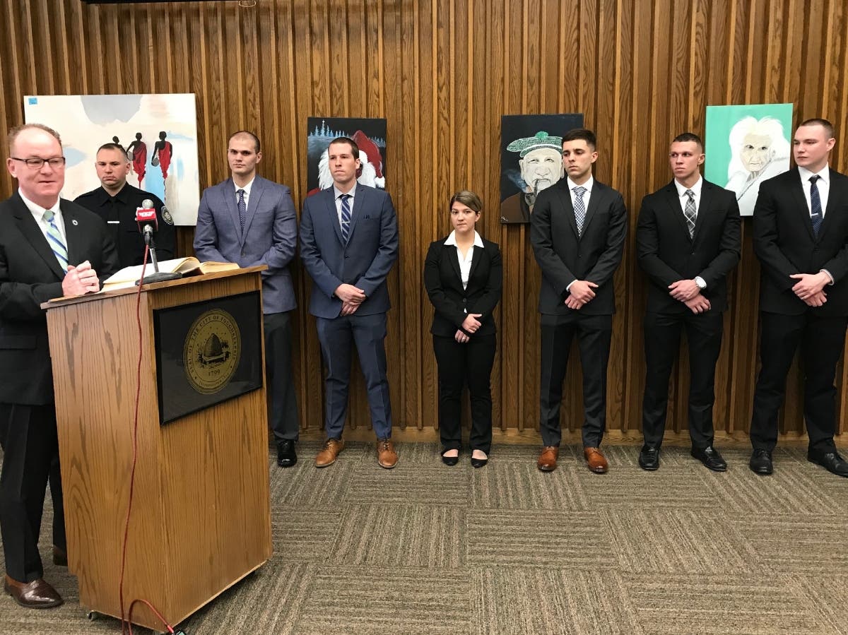 POUGHKEEPSIE, NY — Seven new police recruits were added to the ranks of the City of Poughkeepsie Police Department during a swearing-in ceremony Wednesday. The new officers are Justin P. Consalvo, Danielle M. Costa, Paul Henne, Kyriacos Kyriacou, Gregory Schweizer, Kevin Smith and Robert Prince.