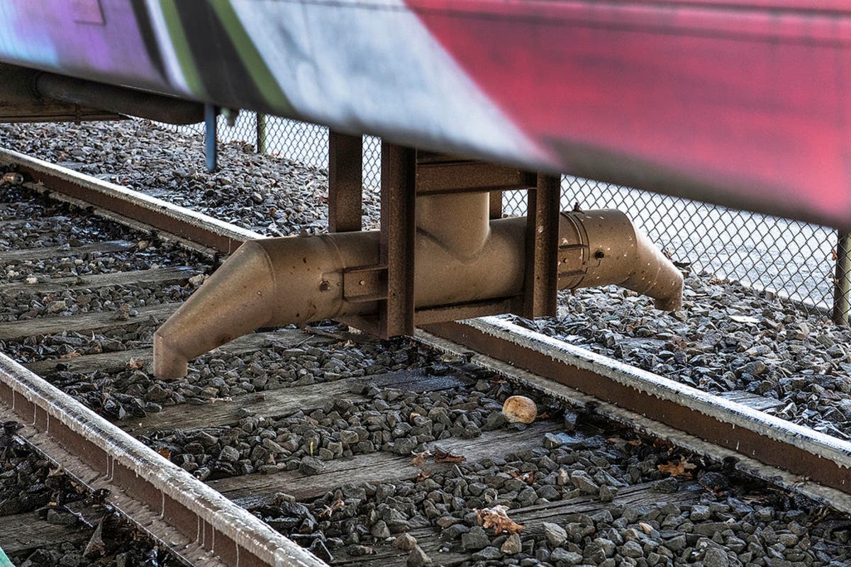 But despite continuous annual efforts, of course it’s impossible to completely prevent leaves from falling onto the tracks. So each fall, the LIRR, Metro-North and Staten Island Railway use the specialized trains to spray jets of water to push leaves from the rails, and either scrub the tracks clean, as on Metro-North, or, as on Long Island, apply a mixture known as sandite, a traction gel that has the consistency of pancake batter and provides improved traction.