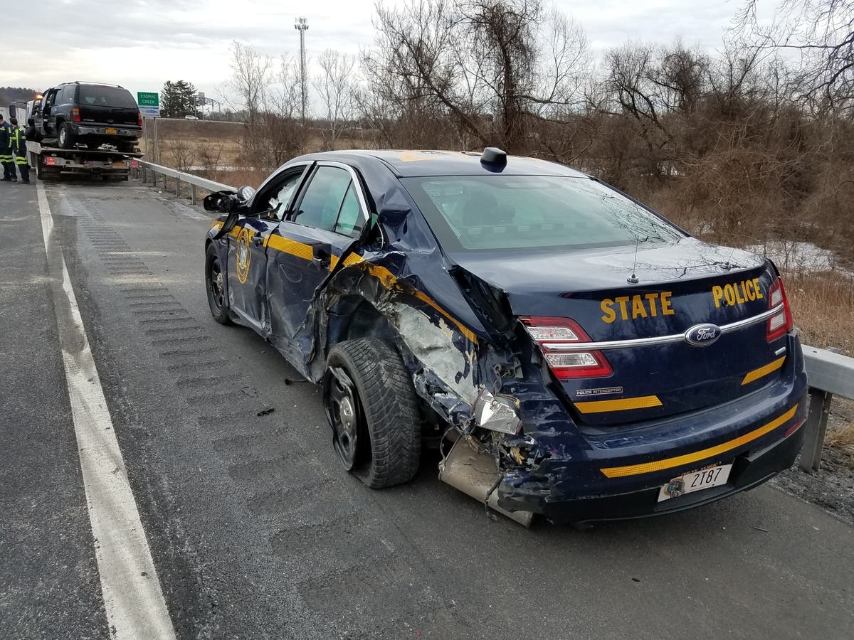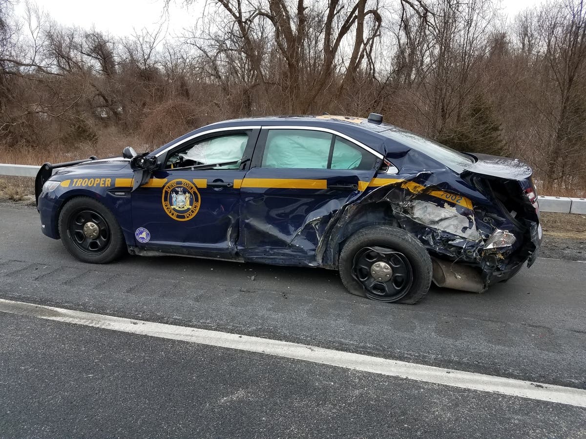 KINGSTON, NY — A state trooper's vehicle was struck by a tractor trailer March 13 on the northbound side of I-87 in the City of Kingston. State police said the incident occurred around 3 p.m. when the trooper's patrol car was assisting a disabled vehicle.