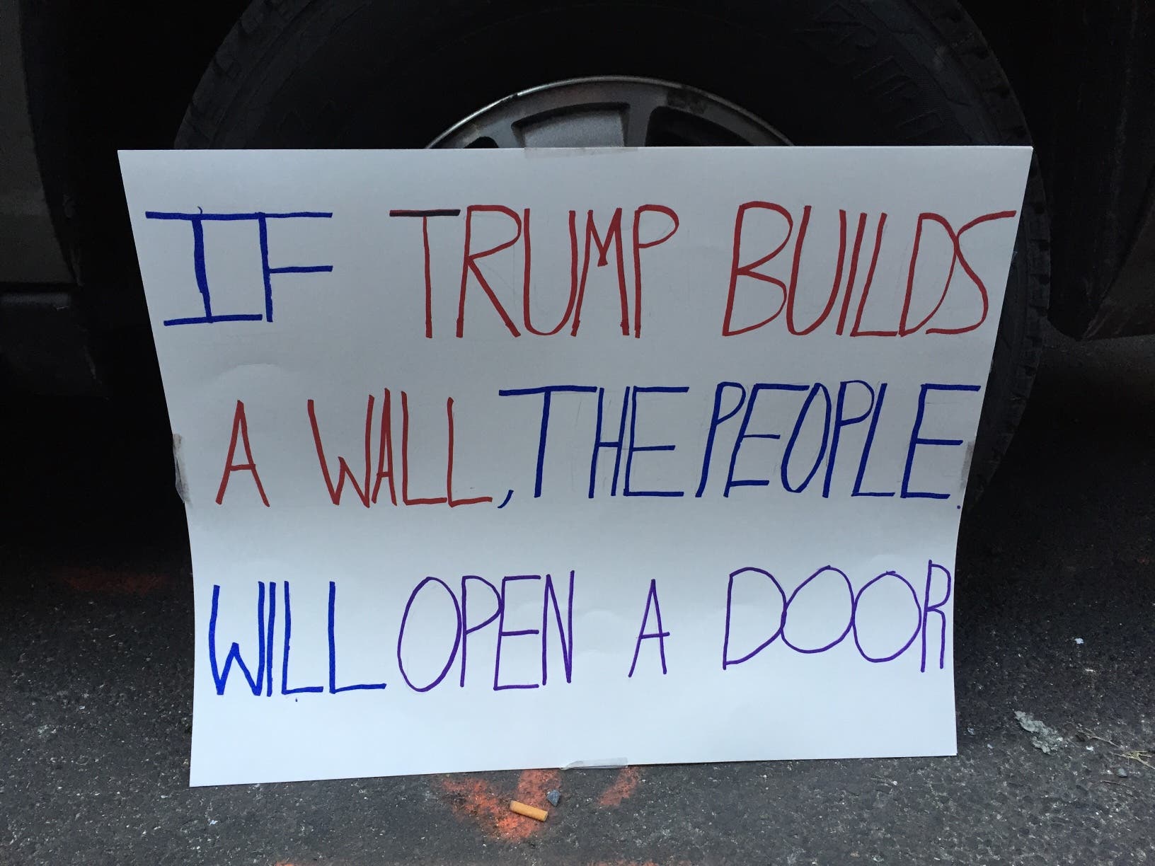 Chloe Morales, a Patch employee at the scene of the protest, reported hearing chants of, "My body, my choice!" from women and men returning with "Her body, her choice!" - "Don't let the planet die! Climate change is not a lie!" - "Say it loud. Say it clear. Refugees are welcome here!" - "Hands too small, can't build a wall!"