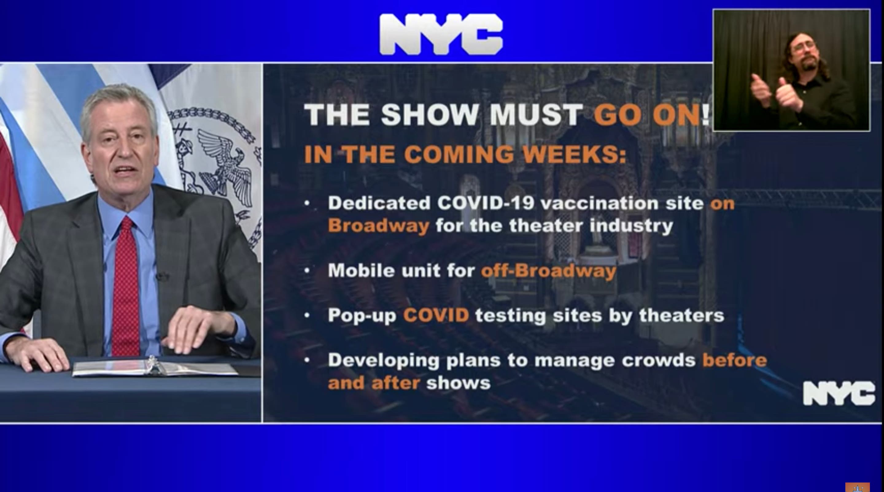Starting in April, the city will set up vaccine sites "in the heart of the Theater District," serving and staffed by theater workers, de Blasio said. A mobile unit will serve off-Broadway theaters.