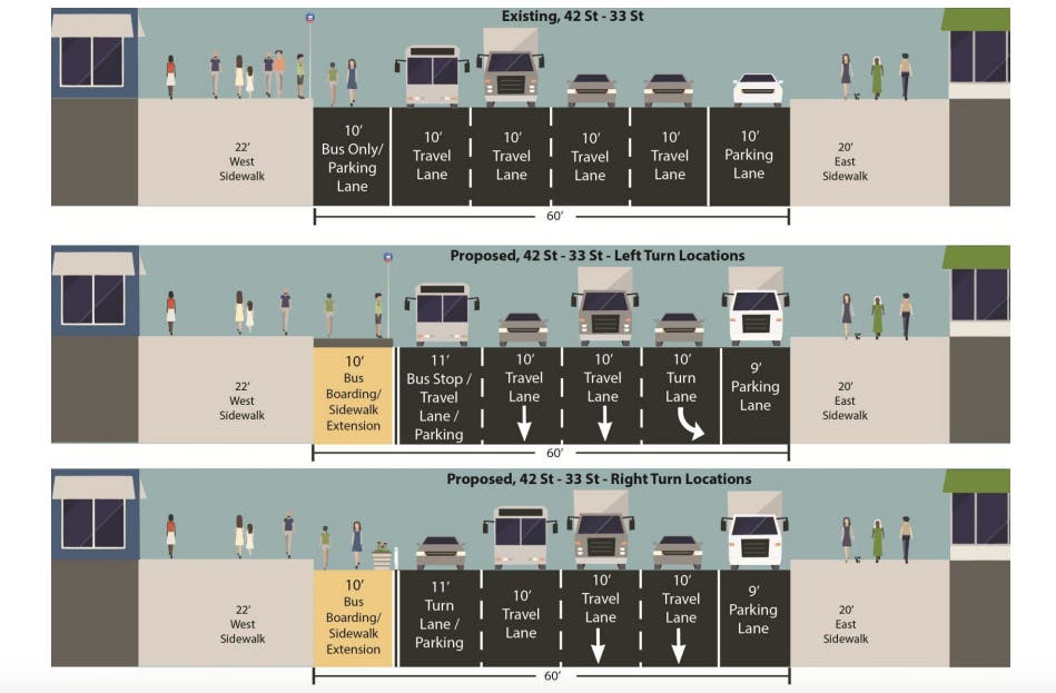 The DOT's plan would also call for the creation of bus boarding islands, left turn lanes and curb extensions on the east side of the avenue.