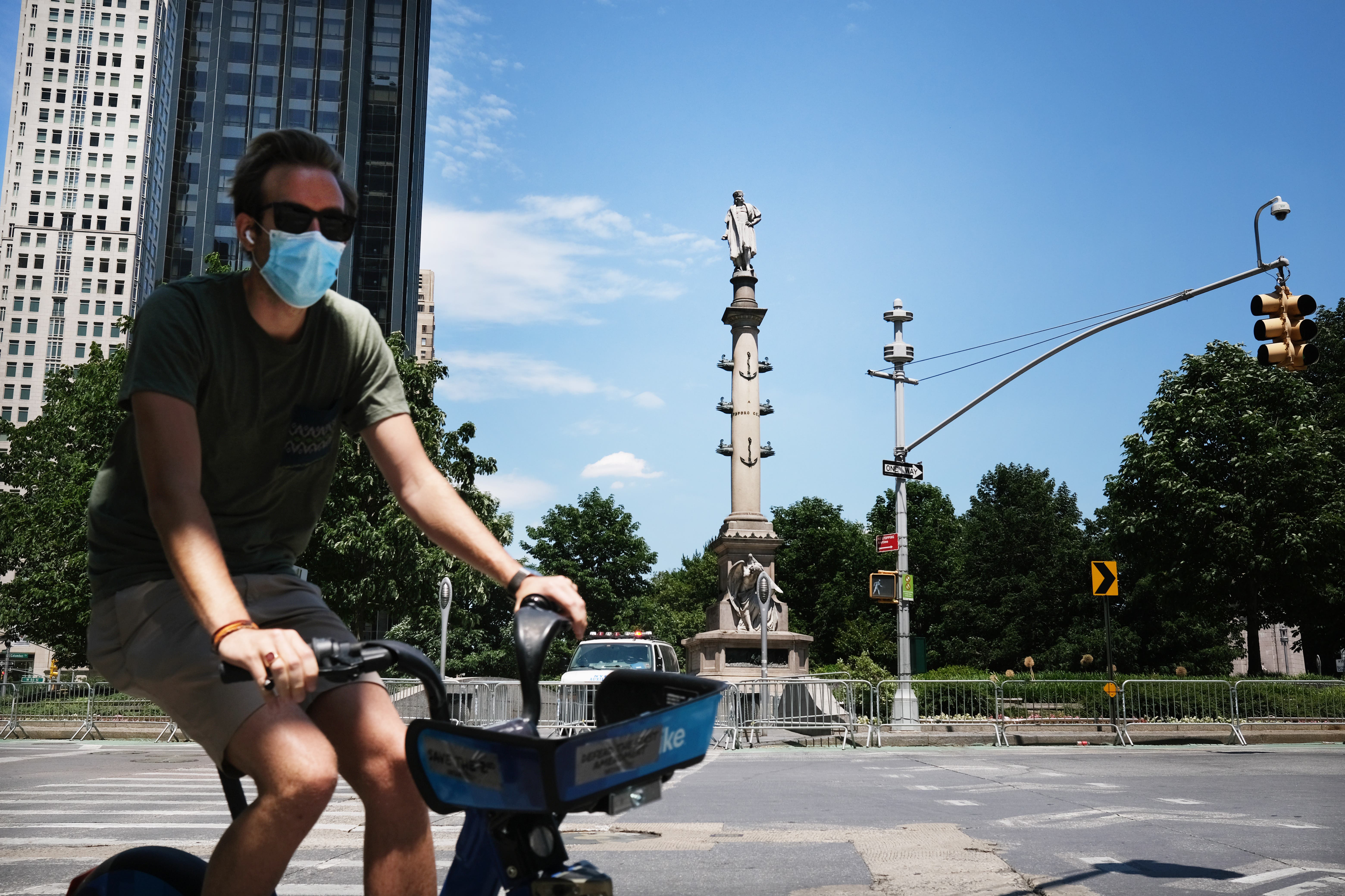 Shortly after protests began in early June over the police killing of George Floyd, the NYPD set up metal barricades around the Christopher Columbus monument, closing off the small park in the middle of the traffic circle and also preventing cyclists from using the bike lanes that surround it.