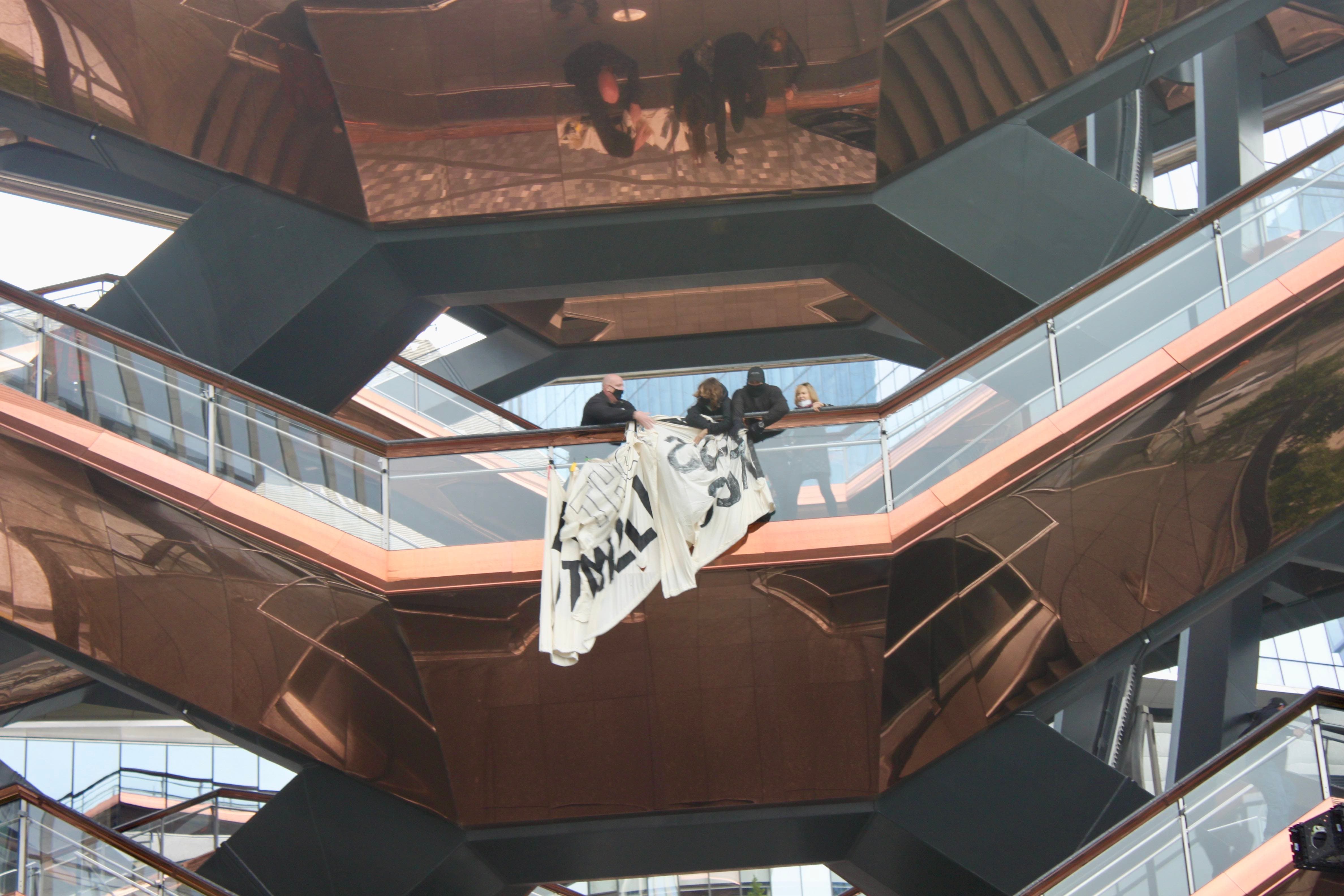 Toward the end of the event, protesters attempted to unfurl a banner reading "House the Homeless, Not Millionaires" from an upper floor of the Vessel. Security officers quickly mounted the stairs and pulled the banner back up.