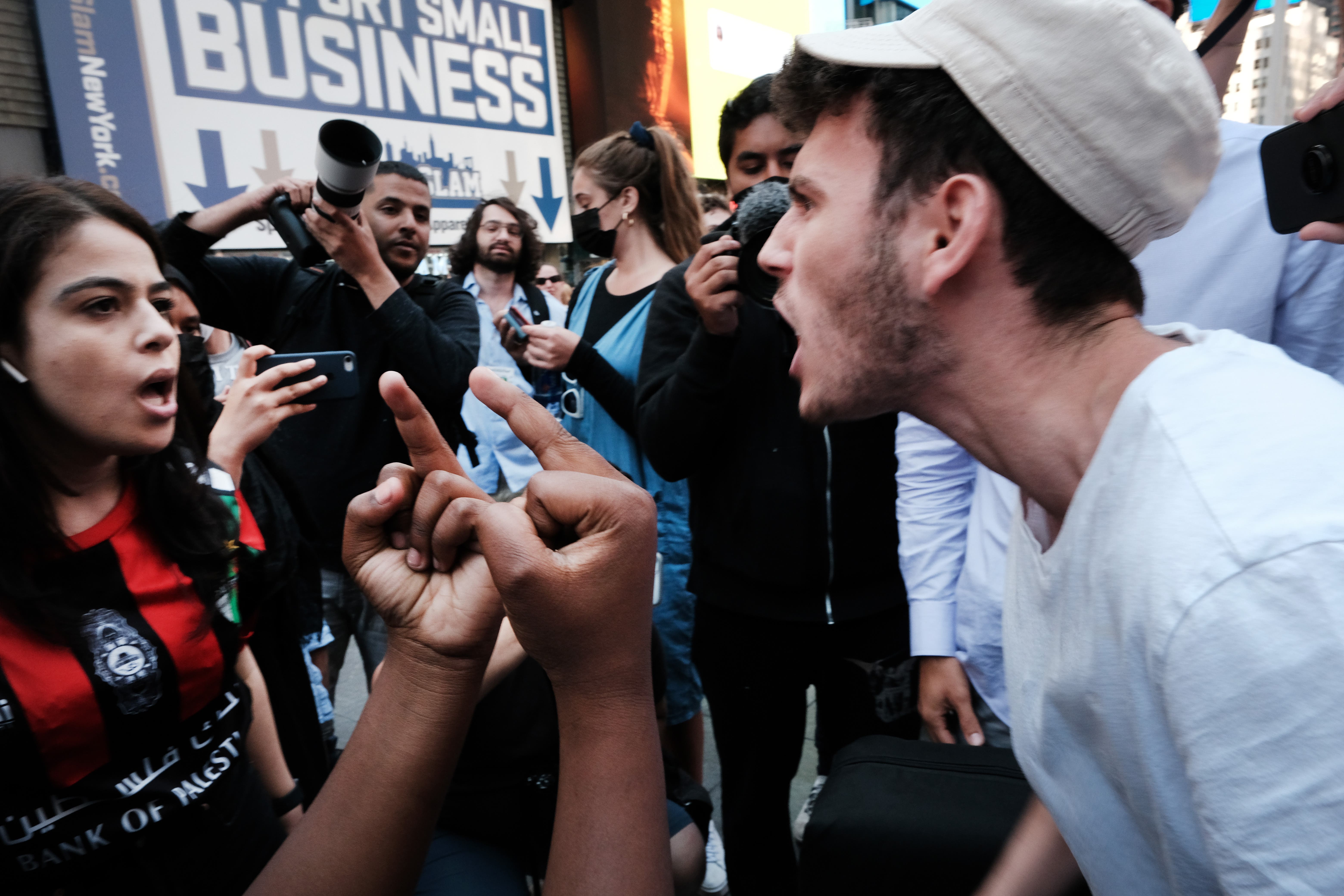 Thursday afternoon's protests, which unfolded amid news of a cease-fire between Israel and Hamas, appeared to begin as separate demonstrations between the two sides, devolving into skirmishes after people breached an NYPD barrier separating the groups, according to the reporter Elad Eliahu.