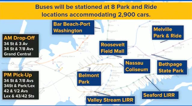 LIRR commuters will also have the option of taking ferries or coach buses into Manhattan, Hakim said. The LIRR will launch two ferry routes, with a capacity of 2,300 riders, from Glen Cove and Hunters Point. Long Islanders will also be able to catch buses from eight different park-and-ride locations. The MTA will launch 200 coach buses daily, with a capacity for 2,900 parking spots, Hakim said.