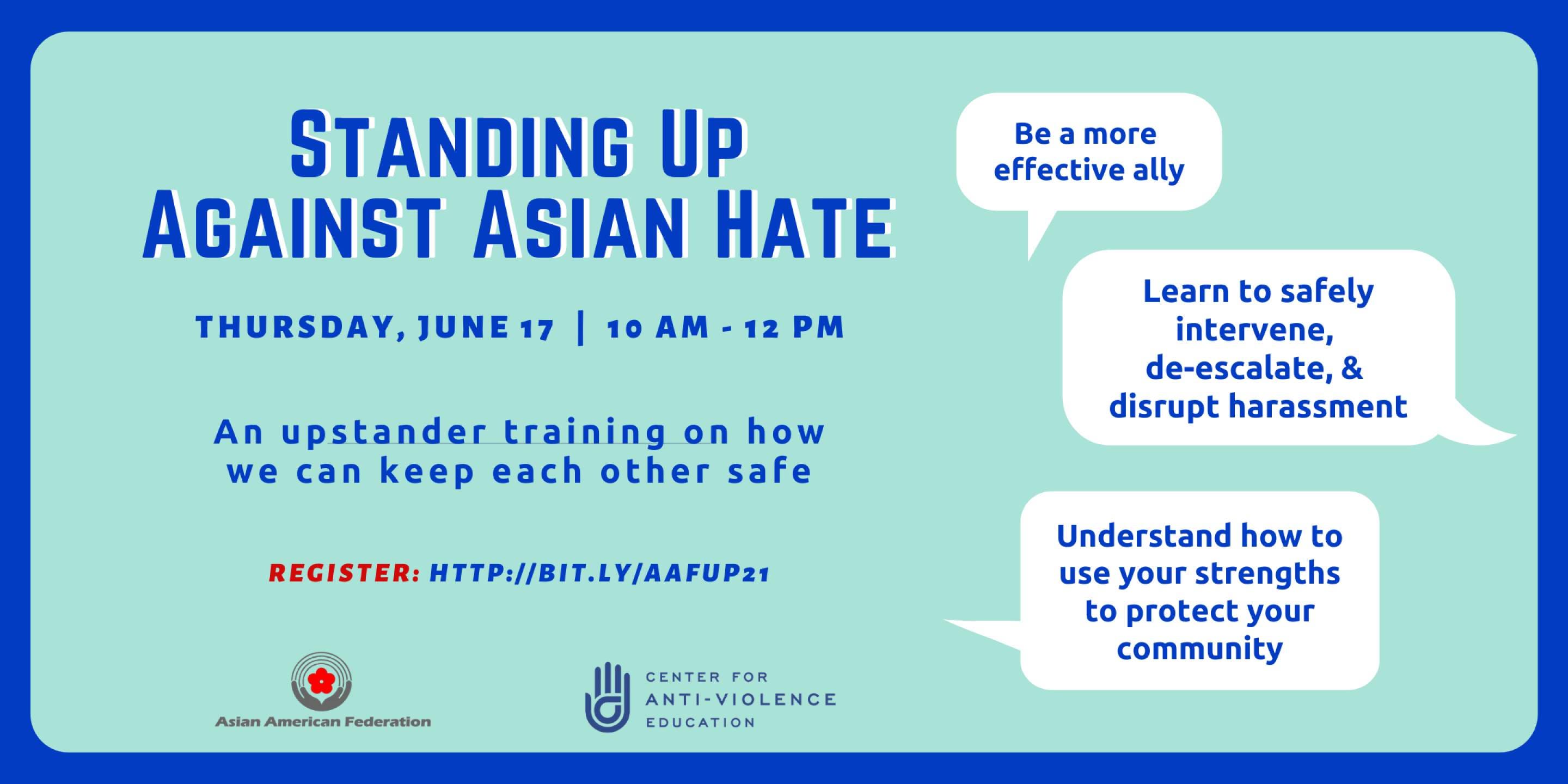 'Join us for our Standing Up Against Asian Hate Upstander Training to learn how to safely intervene in the face of anti-Asian harassment.'