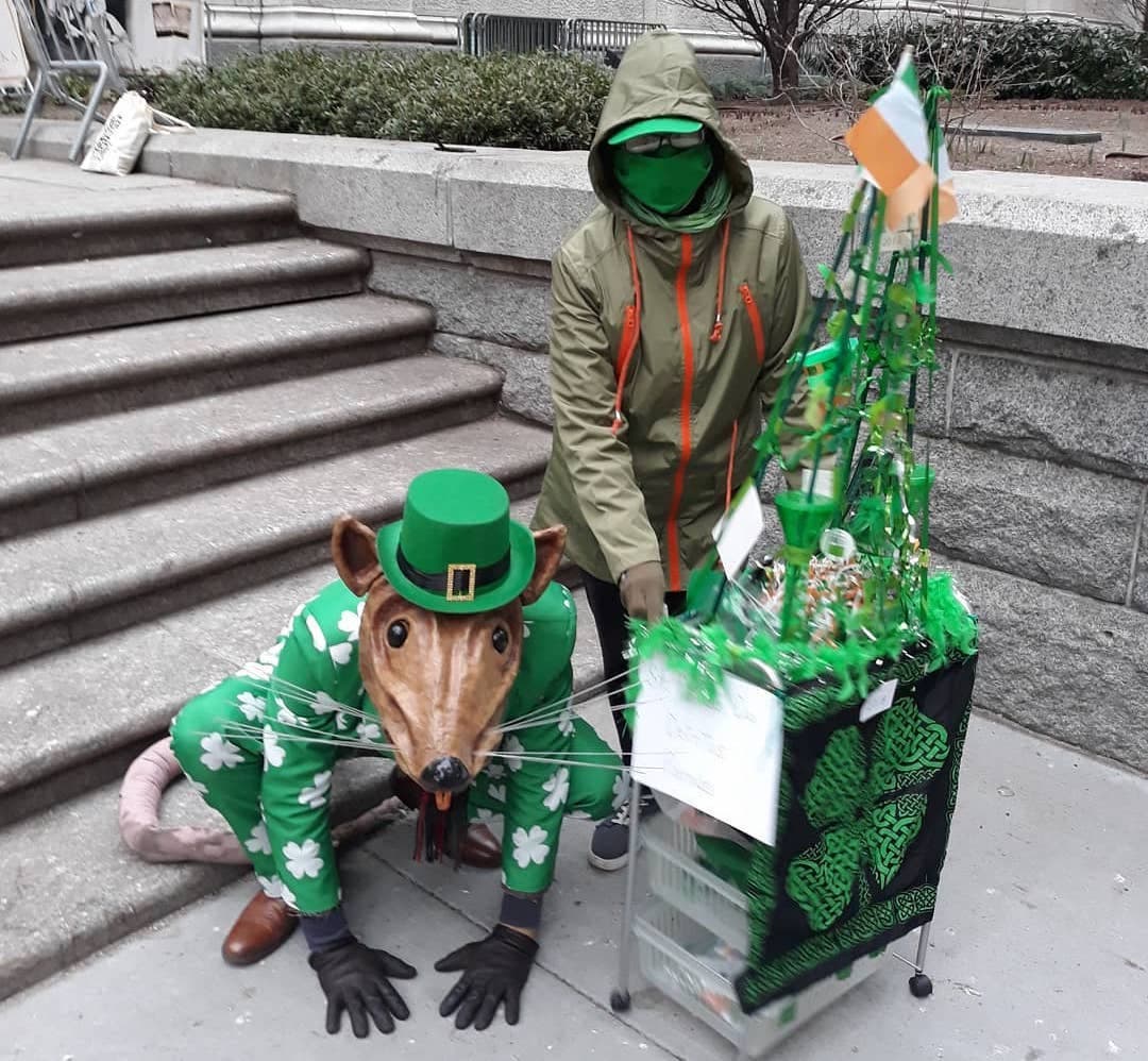 She turned heads as she moved up Fifth Avenue toward the parade's terminus at the American Irish Historical Society near East 80th Street. As she passed St. Patrick's Cathedral, she had a chance encounter with Buddy the Rat, the performance artist whom Broughel has admired for his strange, viral subway antics, and who was in the middle of his own holiday project.