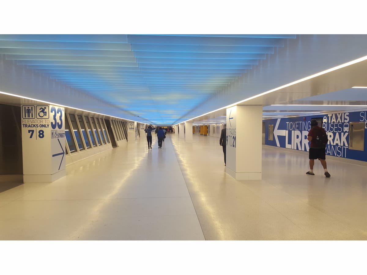 The new concourse allows commuters to enter and exit penn station from the opposite of Eighth Avenue via stairwells at the corners of the Farley Post Office building.
