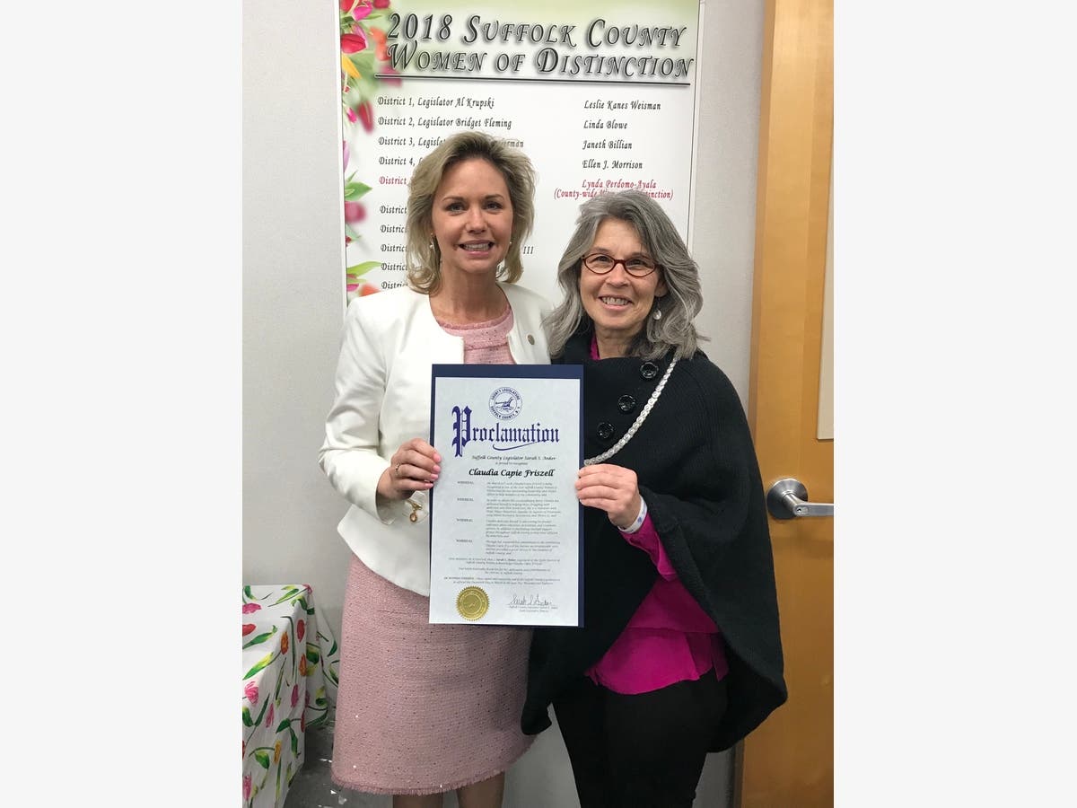Legislator Sarah Anker honored Claudia Capie Friszell as one of the 2018 Suffolk County Women of Distinction.