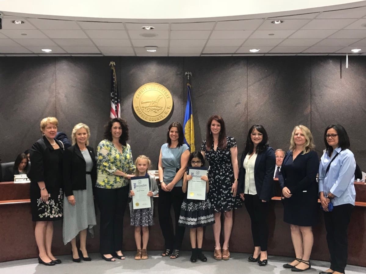 HAUPPAUGE, N.Y. – On Tuesday, June 5th, Suffolk County Legislator Sarah Anker congratulated and presented proclamations to Marah Palank and Natalie Chakaberia, two Brookhaven National Laboratory Science Fair winners from Rocky Point’s Frank J. Carasiti Elementary School. Over 100 Suffolk County schools take part every year in BNL's Elementary School Science Fair. Some 470 projects, created by over 500 Suffolk County children ranging from kindergarten to 6th grade, compete. Marah won in the First Grade category, and Natalie won in the Second Grade category.