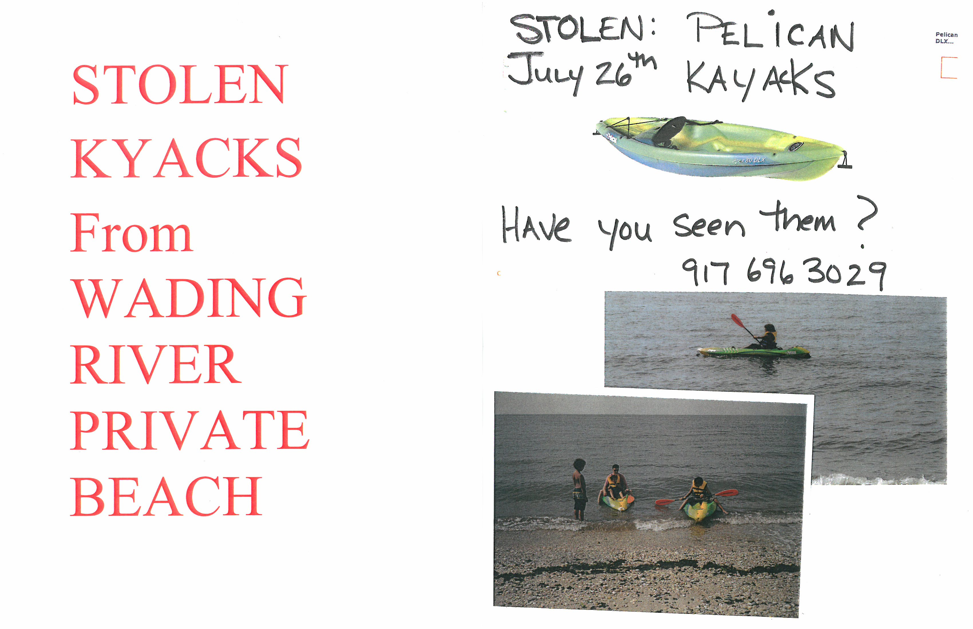 two pelican kyacks were taken form a private beach in wading river friday july 26th, lock found cut and near by...