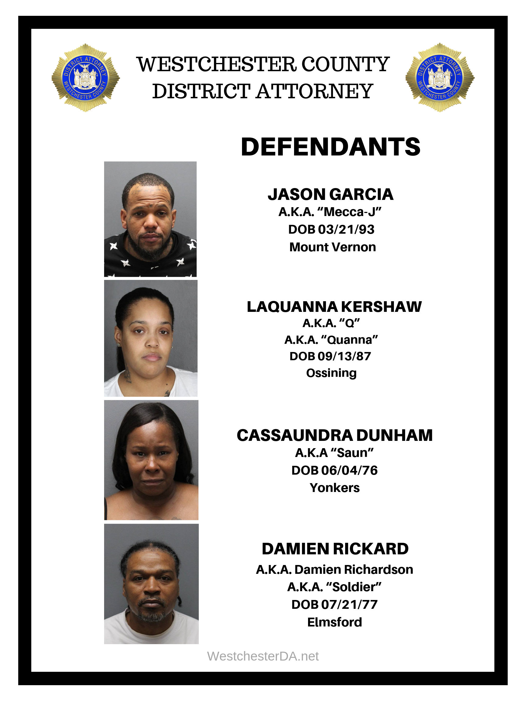 The case is being prosecuted by members of the Westchester County District Attorney’s Investigations Division Gang, Firearms and Narcotics Bureau and Public Integrity Bureau.