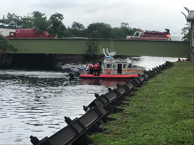 Rescuers were called to the canal on a report that a car had driven through a fence and into the canal near the BJ's gas station in Pelham Manor just before 9 a.m. Friday. The gray SUV quickly became submerged in the murky water.