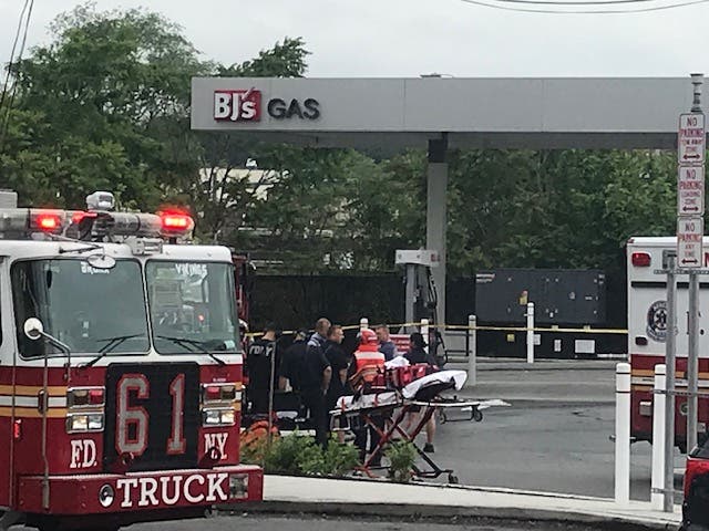 A gray SUV was lifted from the water after driving through a fence at the BJ's gas station in Pelham Manor. (Jeff Edwards)