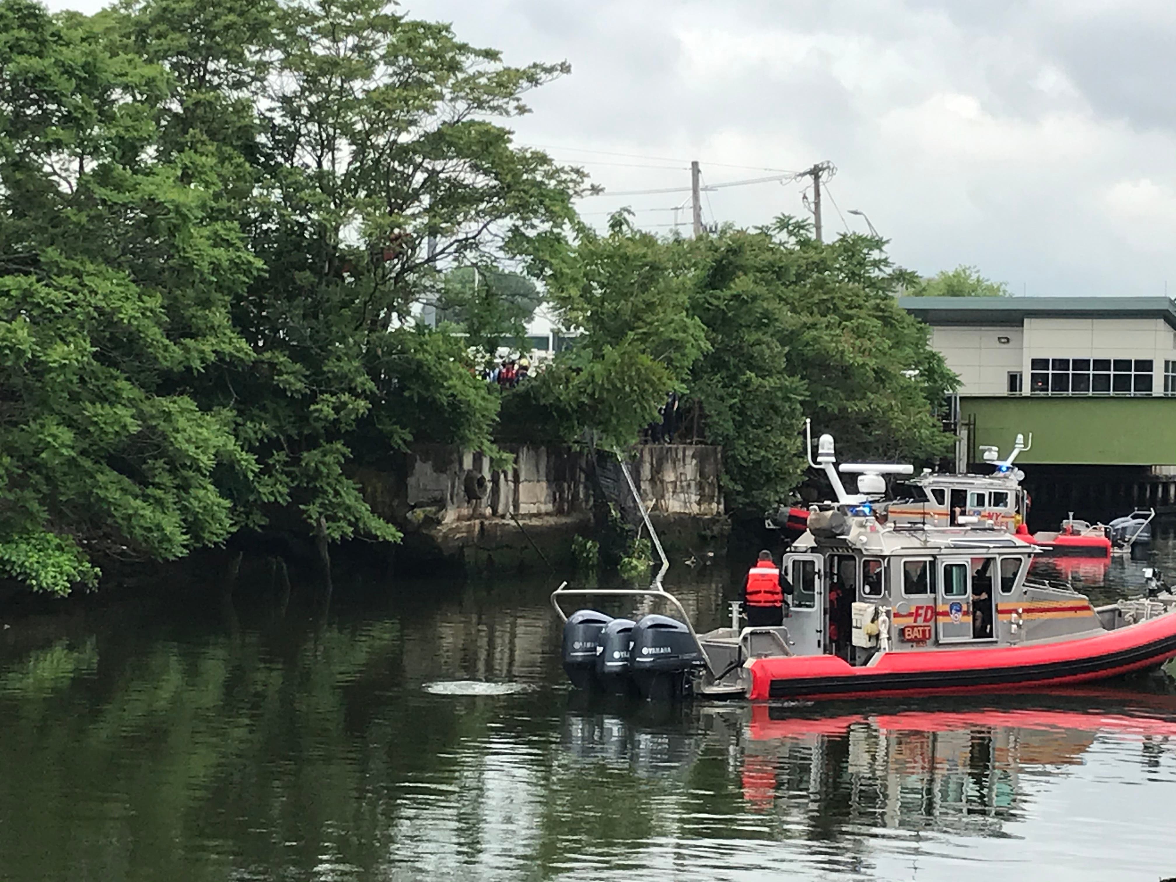 FDNY boats were on the scene of an SUV that was submerged in the canal near the Fulton Avenue Bridge between Mount Vernon and Pelham Manor. (Jeff Edwards)