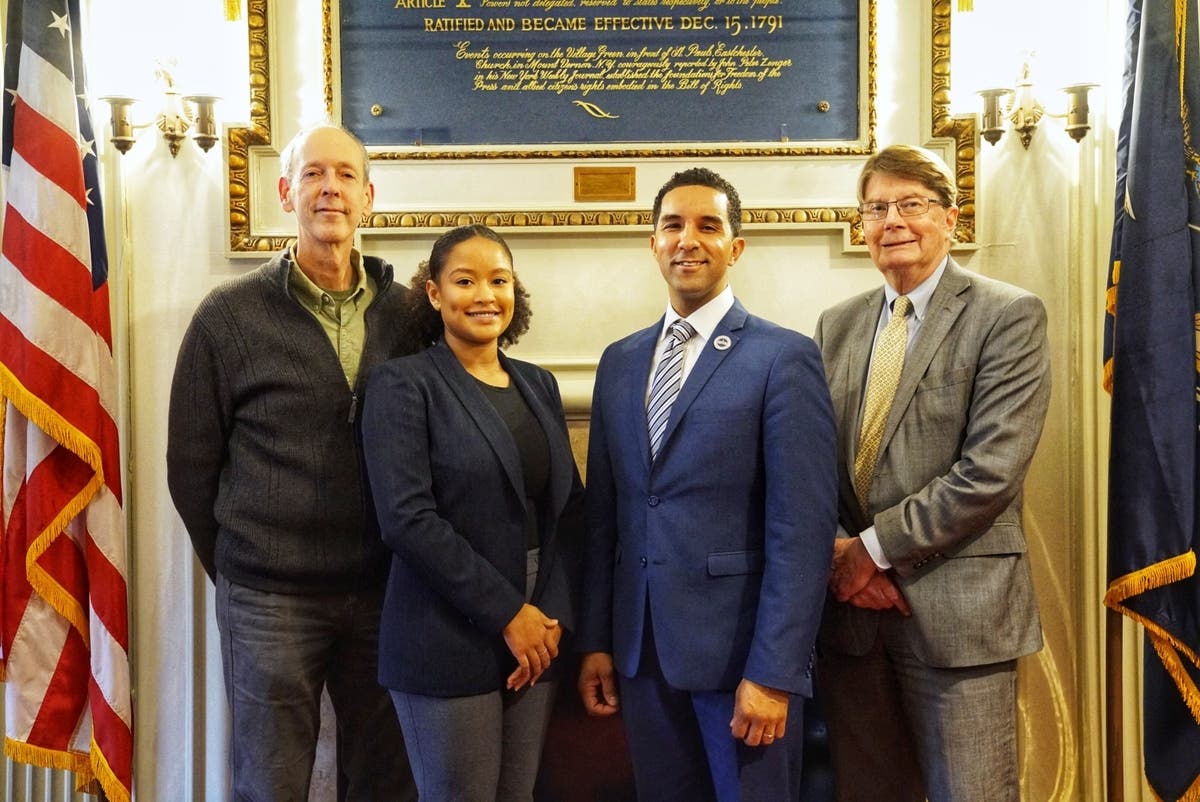 From left to right: Sustainable Westchester representatives Dan Welsh, Jasmine Graham and Bob Elliott stand with Mayor Richard Thomas, second from right.