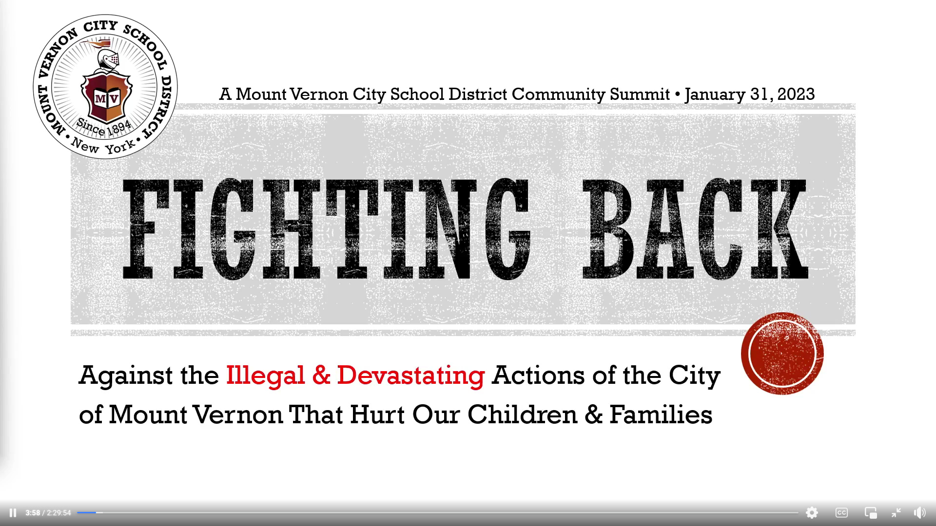 The first slide introduced an emergency public meeting, with a clear position on the issue,"A Mount Vernon City School District Community Summit: Fighting Back Against the Illegal & Devastating Actions of the City of Mount Vernon That Hurt Our Children & Families." The presentation presented a stark "crisis of incompetence, malfeasance, and possible criminality at City Hall that is having a significant impact on the funding of our schools."