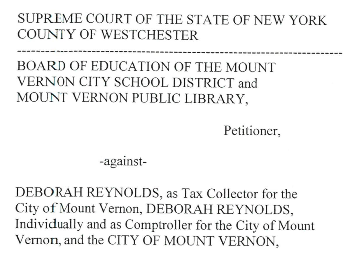 (Mount Vernon, NY) The Mount Vernon City School District has asked the state Supreme Court to order Mount Vernon Comptroller Deborah Reynolds to turn over all the school taxes she has collected.