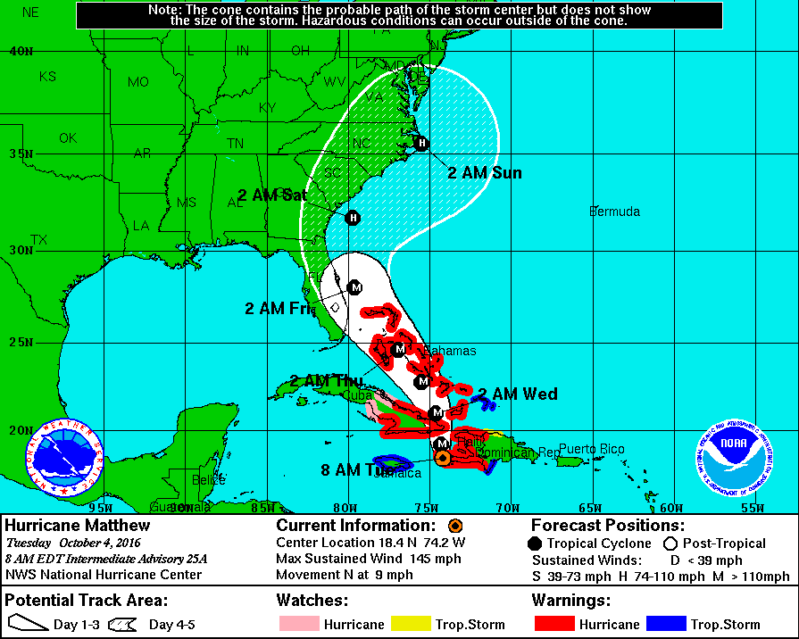 The current forecast may mean significant impacts to Georgia, South Carolina and the Mid-Atlantic states, as well. Hurricane Matthew was located about 10 miles east of Tiburon, Haiti, as of the hurricane center’s 8 a.m. Tuesday update. The storm was moving north at 9 mph.