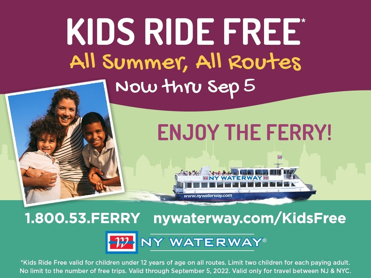 - Kids under age 12 can ride on NY Waterway’s ferries for free on all routes between New Jersey and New York City beginning Tuesday, July 5, 2022 through Labor Day, Monday, September 5, 2022. The ticketing policy for the service is: 2 children (max) are permitted to ride free per each paying adult rider.