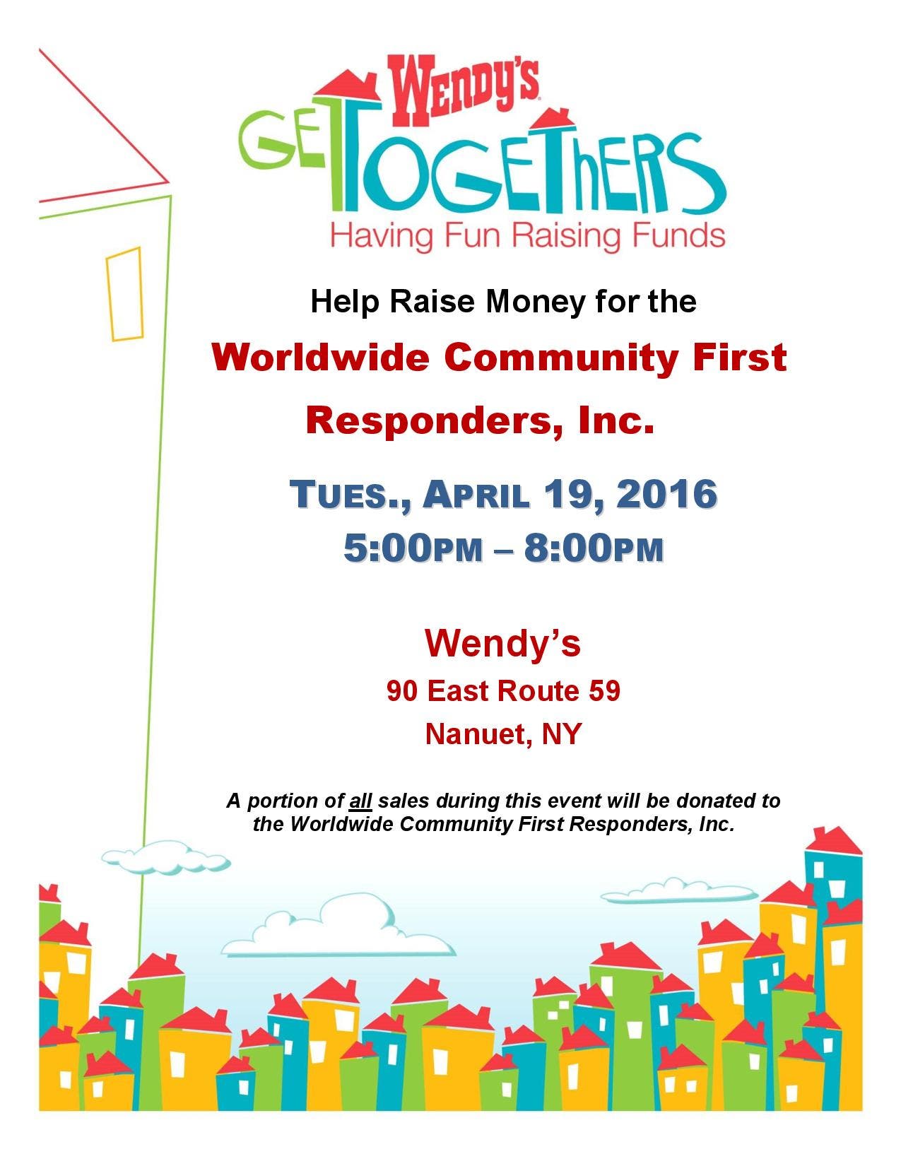 Wendy’s restaurant, located at 90 East Route 59, in Nanuet, NY will fundraise for Worldwide Community First Responder (WCFR) this month on Tuesday, April 19th. The Wendy’s restaurant will donate a percentage of all their sales from 5 p.m. to 8 p.m. to WCFR. Proceeds from the restaurant will go toward meeting WCFR goals for year 2016. For more information, click here to read recent article written by The Journal News.
