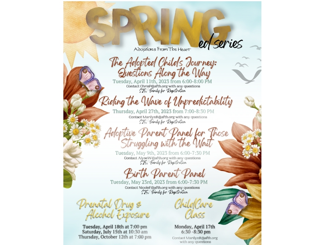 AFTH is inviting you to check out our schedule for the upcoming Ed Series classes. Our Classes provide information for adoptive parents as they go through the adoption process. We offer many different classes with varying topics for what interests you. Check out the dates for available classes if you are interested.