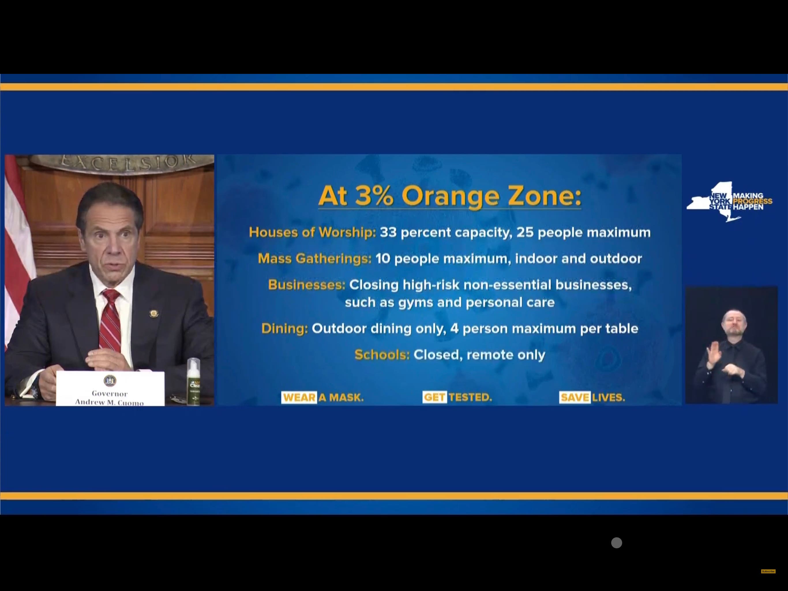 A 3 percent citywide COVID-19 rate by the state's numbers will trigger an orange zone, Cuomo said.