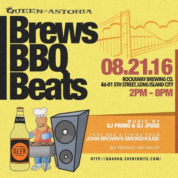 What: Queens-based promoter Queen of Astoria is back with a full six hours of drinking and dancing Sunday at Rockaway Brewing Company — which, yes, is oddly located in Long Island City, although the company did recently "return to its roots" by opening a new tasting room out at the beach. Twenty-five bucks gets you pork products from John Brown Smokehouse and hip-hop spins from deejays Primo and JFuse. And of course, since the event is, you know, at a brewery, there will be (very good) beer. (Pro tip: Should you wish to taste brews from LOTS of local companies, you might also want to swing by the Beergarden at North Brooklyn Farms on Saturday.) But for more information and tickets for the Rockaway Brewery thing, go here.