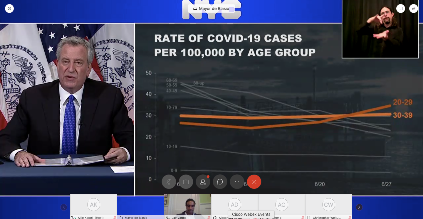 Mayor Bill de Blasio on Monday highlighted a "worrisome" spike in COVID-19 infections rates among New Yorkers aged 20 to 29. He contrasted young New Yorkers' rise in illnesses with steadily falling numbers in almost every coronavirus measurement — including a daylong respite from virus-linked deaths.