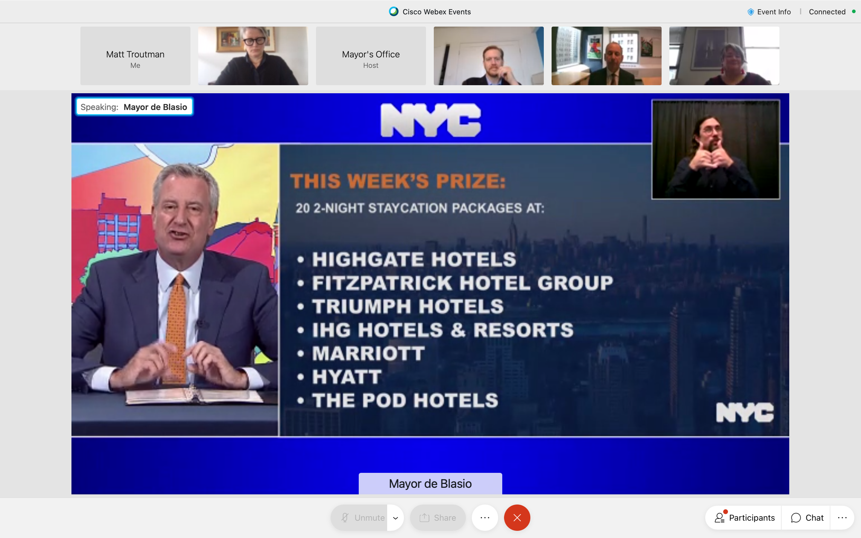 Beyond that, the city has a weekly contest for adults who get shots at city-run vaccination sites. This week, it's the "staycation" packages that de Blasio outlined.