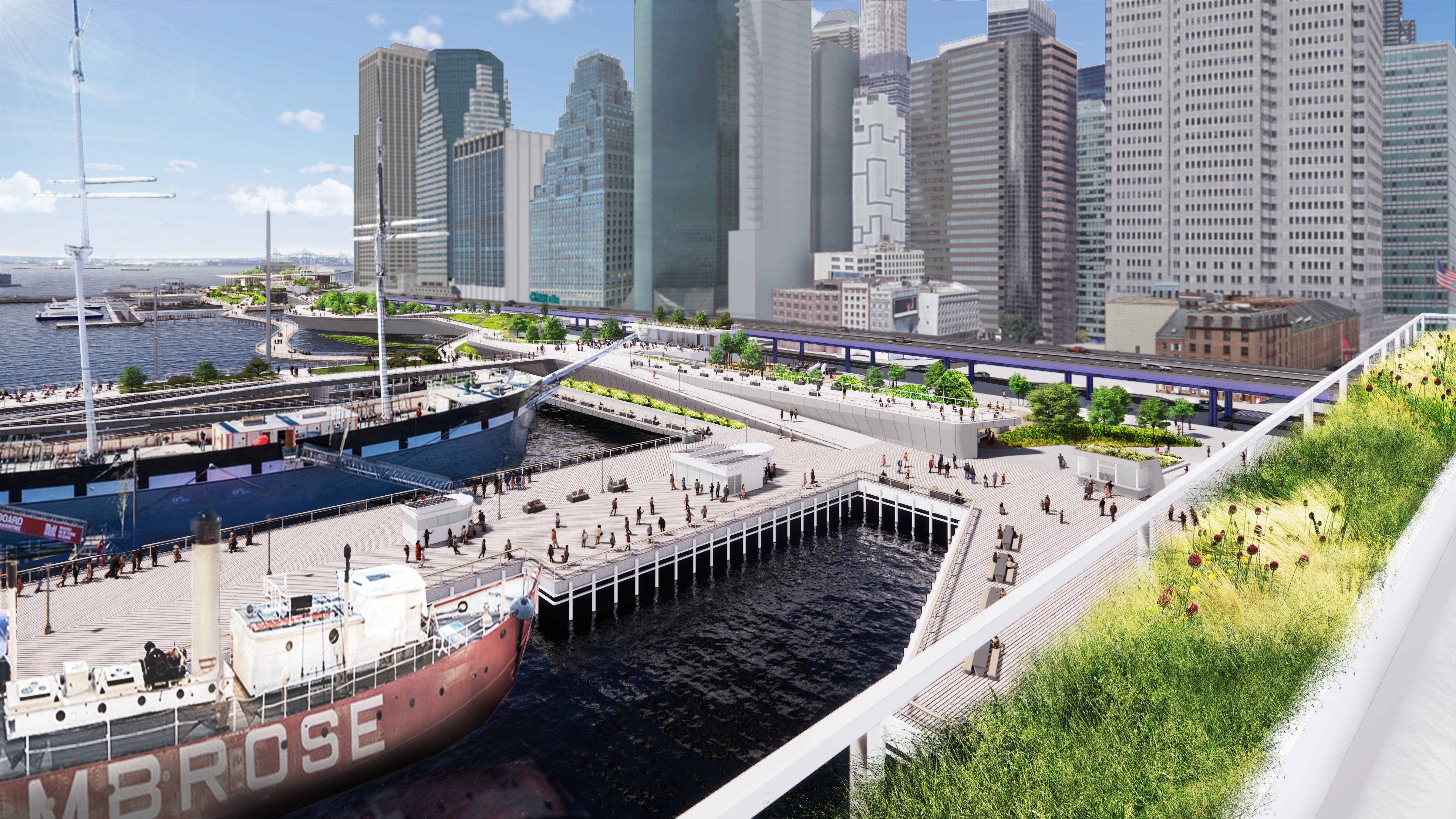 The master plan also includes flood walls built into the landscape, creating ridges along the waterfront to shield Lower Manhattan from coastal storms; new stormwater infrastructure; "resilient" ferry terminals and piers; coves to protect the ecology of the East River; and new public open spaces with accessible entrances and pathways.