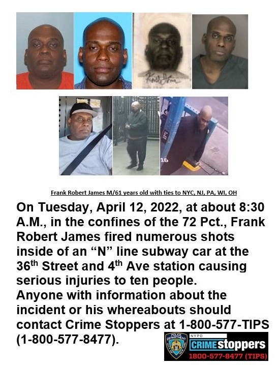 "On 4/12/22 at 8:30 AM, Frank Robert James fired numerous gun shots inside an 'N' line subway car at 36th St & 4th Ave subway station causing serious injuries to 10 people," NYPDnews tweeted. "Anyone with info about the incident or his whereabouts should contact @NYPDTips or call 1-800-577-TIPS."