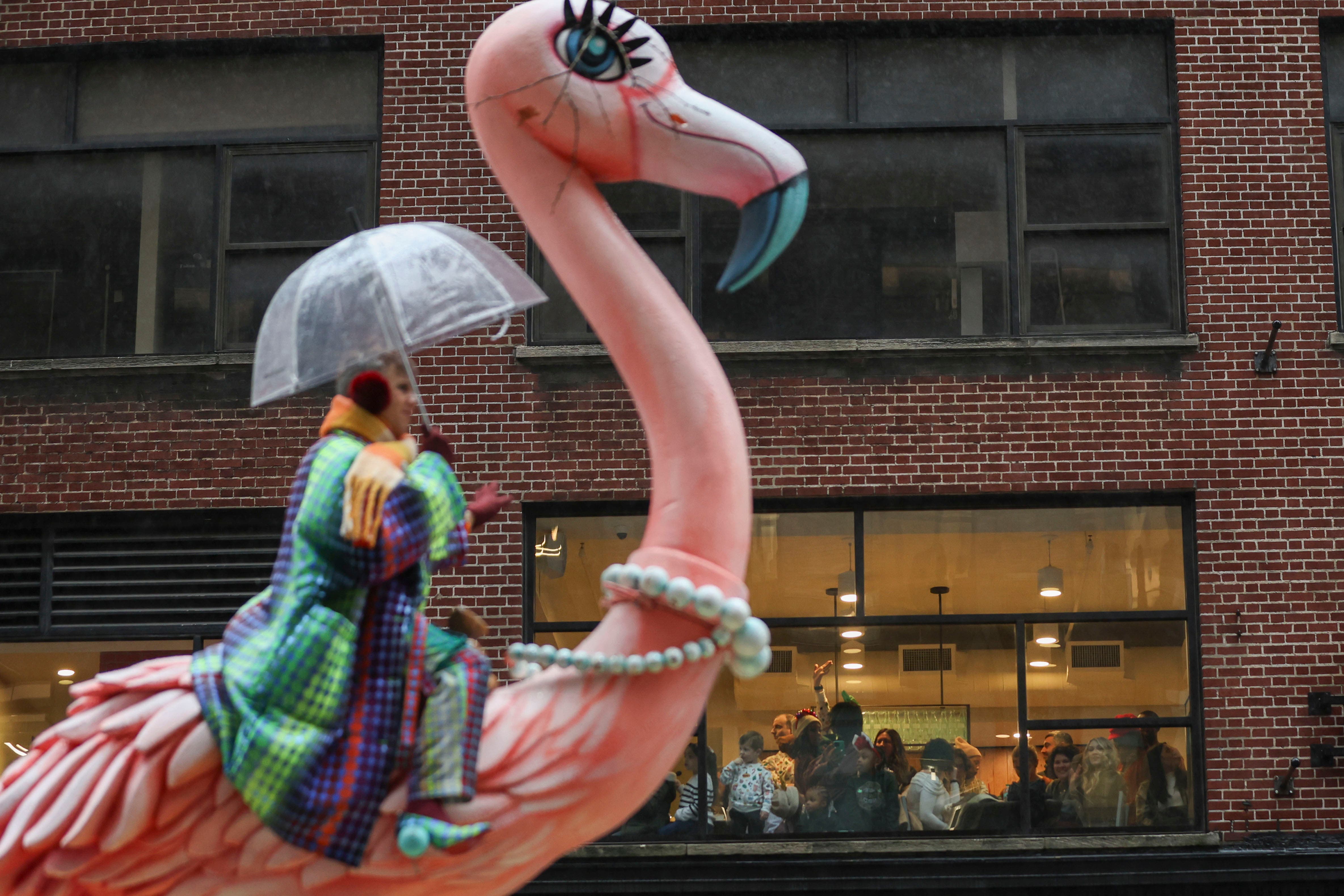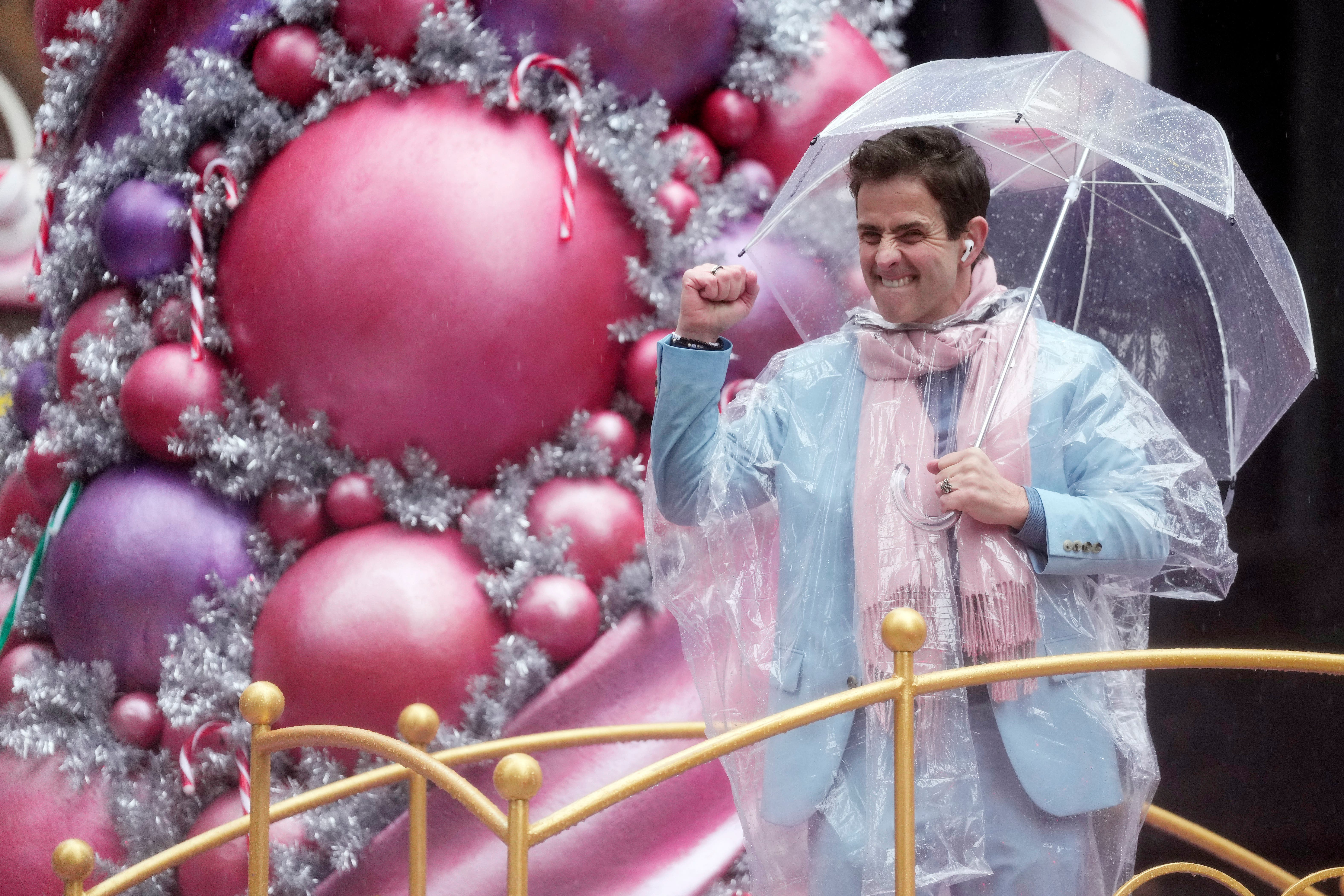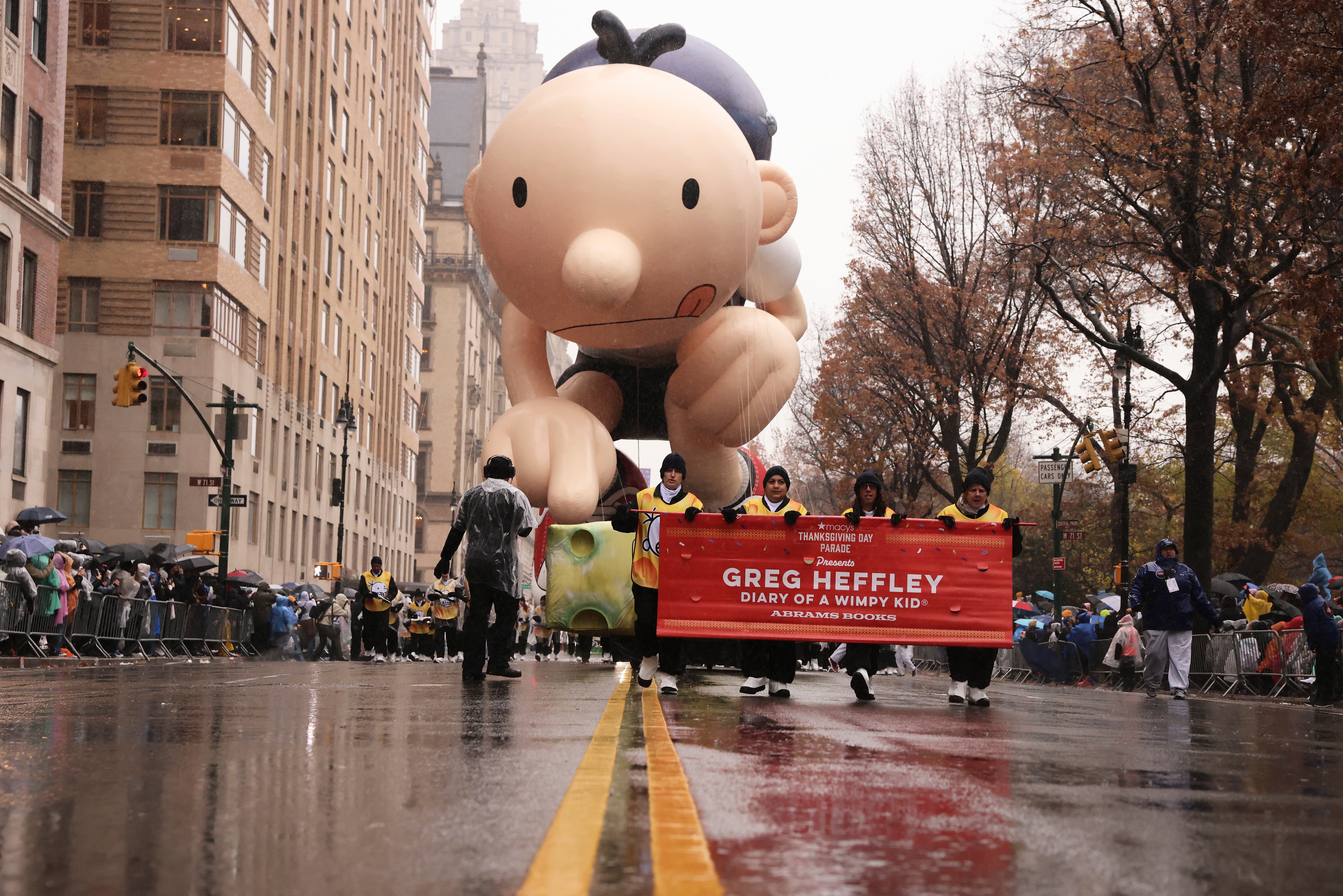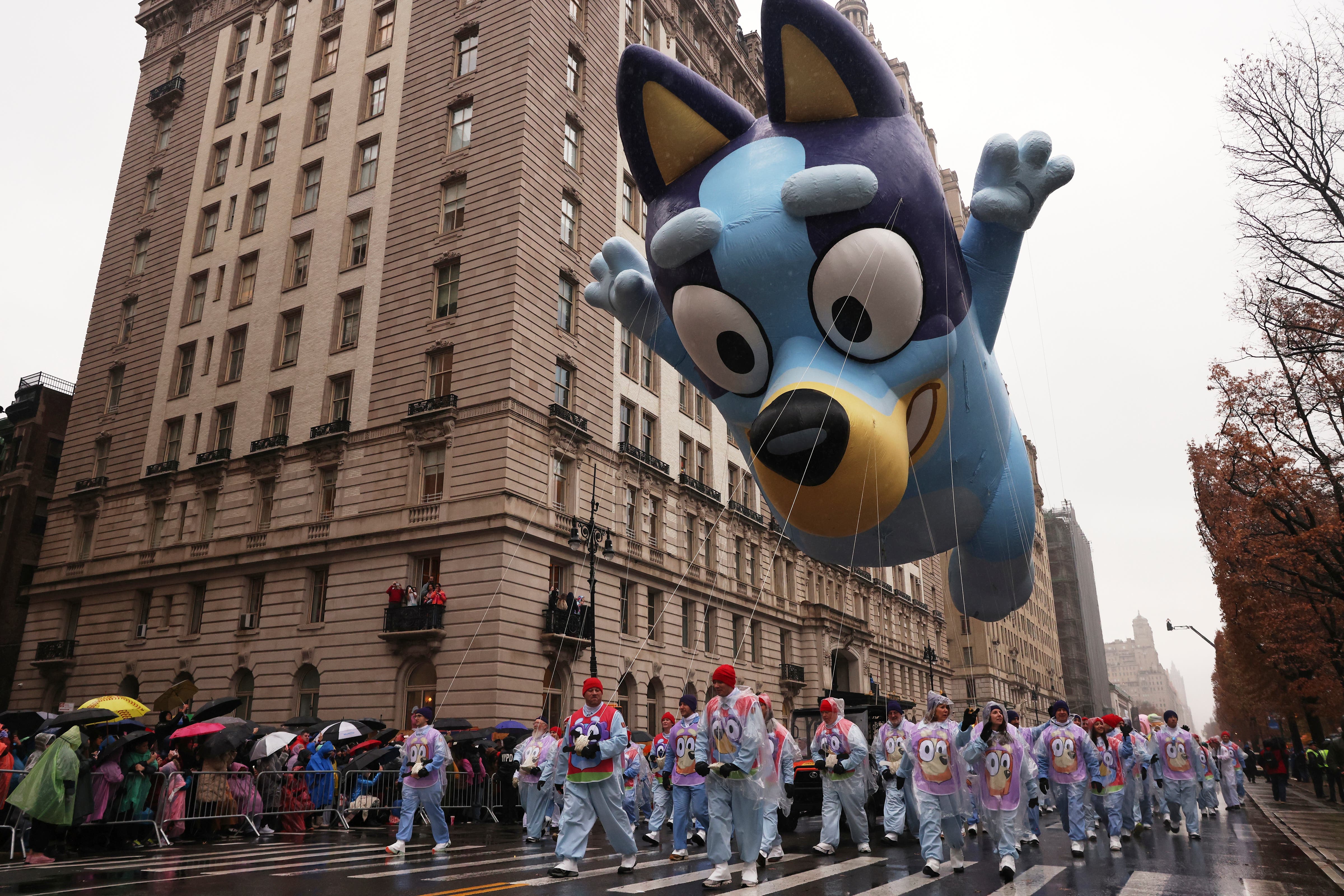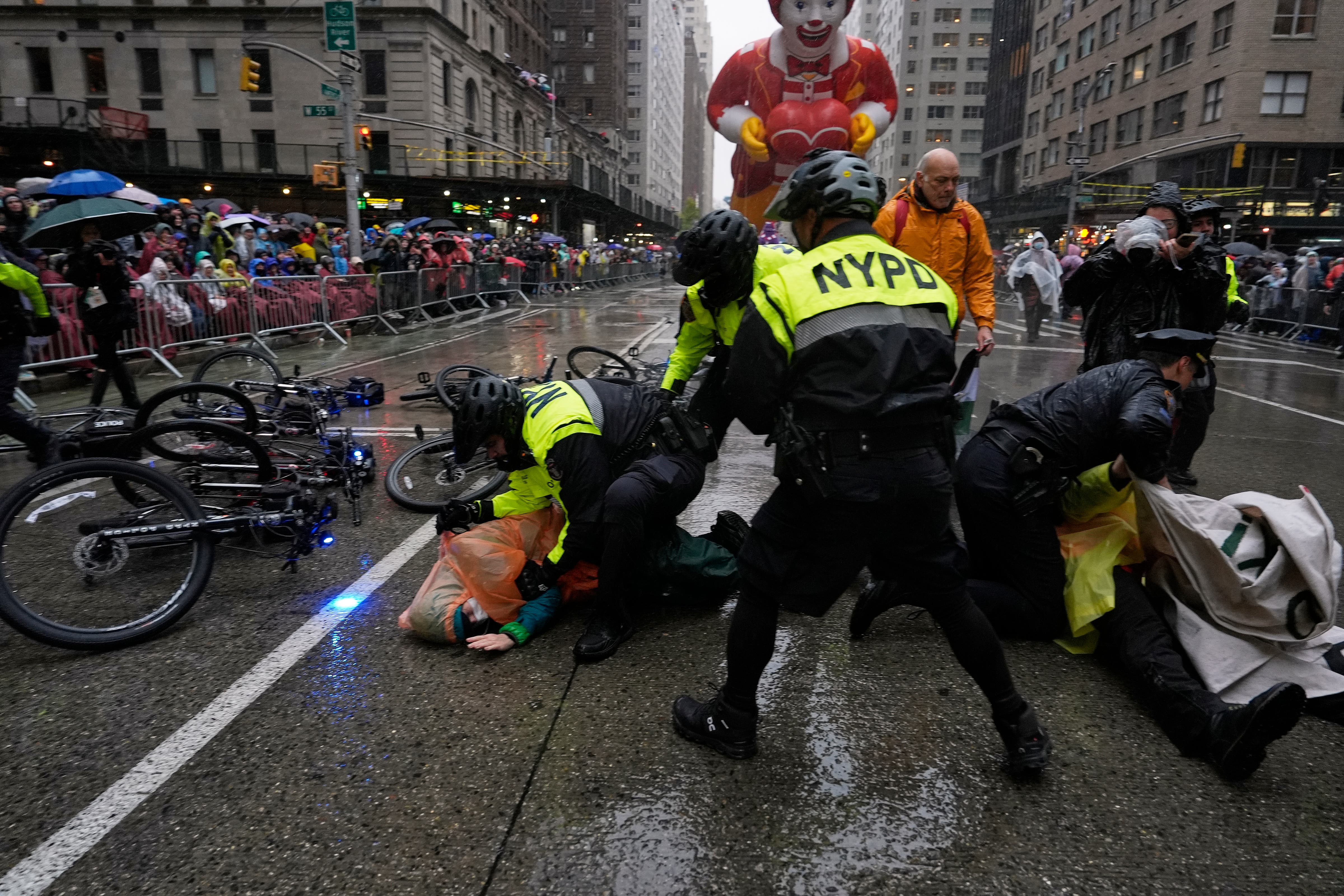 Handlers guide the SpongeBob SquarePants balloon down Sixth Avenue during the Macy's Thanksgiving Day Parade, Thursday, Nov. 28, 2024, in New York. (AP Photo/Julia Demaree Nikhinson)Quenton Lindstrom and his friends and family watch the Macy's Thanksgiving Day parade from above while inside Spirit Lab Yoga, Thursday, Nov. 28, 2024, in New York. (AP Photo/Heather Khalifa)A performer dressed as a candy cane walks down Sixth Avenue during the Macy's Thanksgiving Day Parade, Thursday, Nov. 28, 2024, in New York. (AP Photo/Julia Demaree Nikhinson)Billy Porter performs during the Macy's Thanksgiving Day Parade on Thursday, Nov. 28, 2024, in New York. (Photo by Charles Sykes/Invision/AP)Joey McIntyre rides a float in the Macy's Thanksgiving Day Parade on Thursday, Nov. 28, 2024, in New York. (Photo by Charles Sykes/Invision/AP)People watch from inside as the Macy's Thanksgiving Day parade goes by, Thursday, Nov. 28, 2024, in New York. (AP Photo/Heather Khalifa)Pro-Palestinian protesters demonstrate on Sixth Avenue during the Macy's Thanksgiving Day Parade, Thursday, Nov. 28, 2024, in New York. (AP Photo/Julia Demaree Nikhinson)New York Police arrest Pro-Palestinian protesters who were demonstrating on Sixth Avenue during the Macy's Thanksgiving Day Parade, Thursday, Nov. 28, 2024, in New York. (AP Photo/Julia Demaree Nikhinson)The Macy's Great American Marching Band plays as it heads down Sixth Avenue during the Macy's Thanksgiving Day Parade, Thursday, Nov. 28, 2024, in New York. (AP Photo/Julia Demaree Nikhinson)Spectators watch from an apartment balcony as Disney's Minnie Mouse balloon floats by on Central Park West during the Macy's Thanksgiving Day Parade, Thursday, Nov. 28, 2024, in New York. (AP Photo/Yuki Iwamura)Handlers pull the Bluey balloon down Central Park West during the Macy's Thanksgiving Day Parade, Thursday, Nov. 28, 2024, in New York. (AP Photo/Yuki Iwamura)Handlers pull the Diary of a Wimpy Kid balloon down Central Park West during the Macy's Thanksgiving Day Parade, Thursday, Nov. 28, 2024, in New York. (AP Photo/Yuki Iwamura)People stand in the rain along Sixth Avenue ahead of the start of the Macy's Thanksgiving Day Parade, Thursday, November 28, 2024, in New York. (AP Photo/Julia Demaree Nikhinson)People inflate floats in preparation for the Macy's Thanksgiving Day Parade, Wednesday, Nov. 27, 2024, in New York. (AP Photo/Yuki Iwamura)People inflate floats in preparation for the Macy's Thanksgiving Day Parade, Wednesday, Nov. 27, 2024, in New York. (AP Photo/Yuki Iwamura)