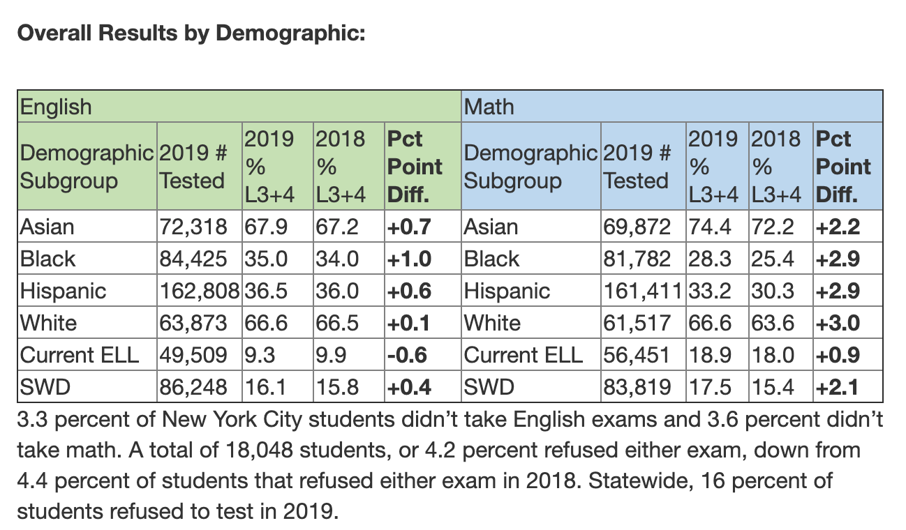 “Today we celebrate the hard work of New York City children, families and educators,” said Schools Chancellor Richard A. Carranza. “This progress, along with record-high graduation and college enrollment rates, is further evidence that our Equity and Excellence for All agenda is working, and for the first time, we’re seeing promising signs from our Pre-K for All initiative reflected in State test scores. We are more determined than ever to advance equity now and ensure all New York City public school students have access to the high-quality education they deserve.”