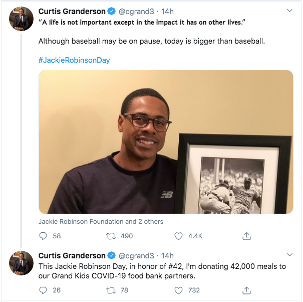 Former New York Yankees and Mets outfielder Curtis Granderson donated 42,000 meals to local food banks to help with the coronavirus relief through his non-profit Grand Kids Foundation. In 2016, Granderson won the Roberto Clemente Award and is a four-time winner of the Marvin Miller Man of the Year Award for his exemplary community service initiatives off the field.