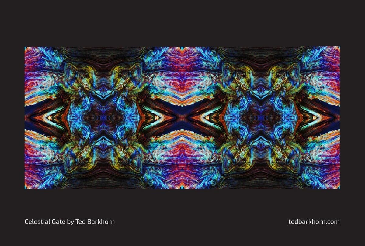 Barkhorn’s photography of the Redwood roots is unadulterated, there is no manipulation of the form, the light, or the discovery. Color, selected by, he says, “an unseen hand” may bring forward a pattern formed by the wood itself. This pattern that’s revealed only by the camera, is mirrored for a kinetic, kaleidoscopic effect. The images remain genuinely true to nature. Indeed, as, Barkhorn wants us to remember, it was Henry David Thoreau who said, “It’s not what you look at that matters, it’s what you see.”