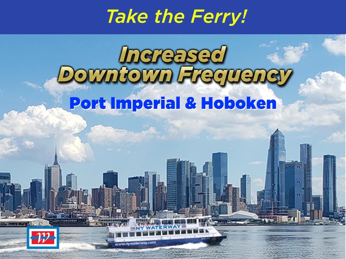 Beginning, Monday, June 21, NY Waterway will be increasing the frequency of weekday Downtown Manhattan ferry service from Port Imperial, Hoboken 14th Street and Hoboken NJ Transit Terminal. Currently, weekday service to Downtown operates every hour during rush hours. Weekday Downtown ferries will run every 40 minutes (Weehawken & Hoboken).