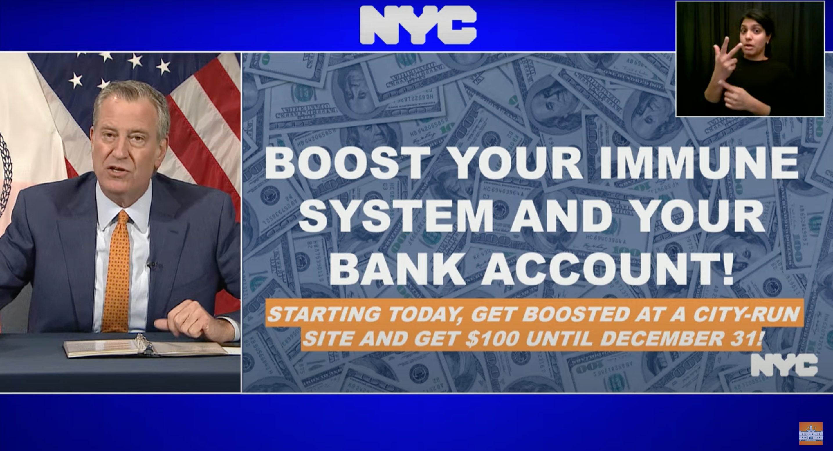 Mayor Bill de Blasio on Tuesday announced the city will offer a $100 incentive for people who get booster doses at city-run and SOMOS vaccination sites.