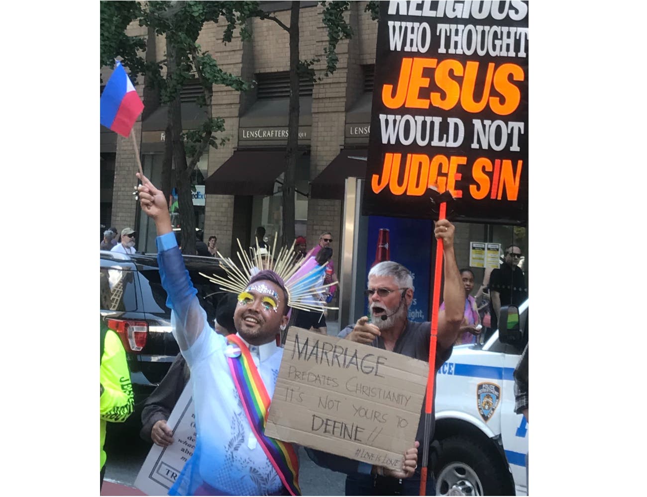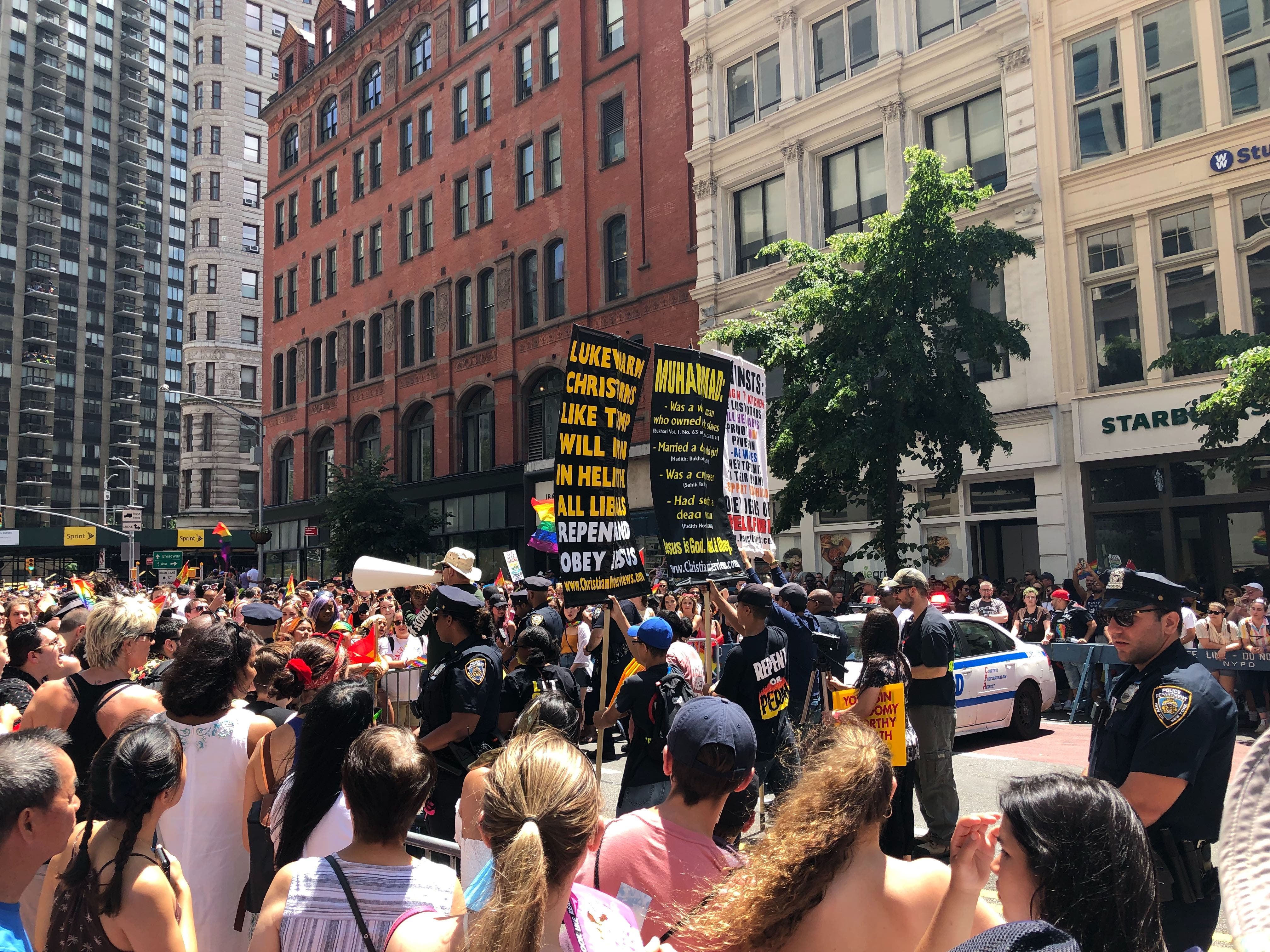 Behind her, a group of Pride March protesters gathered carrying signs that called on President Trump to ban gay marriage, on feminists to "Return to the kitchen," and personal interpretations of the Bible.